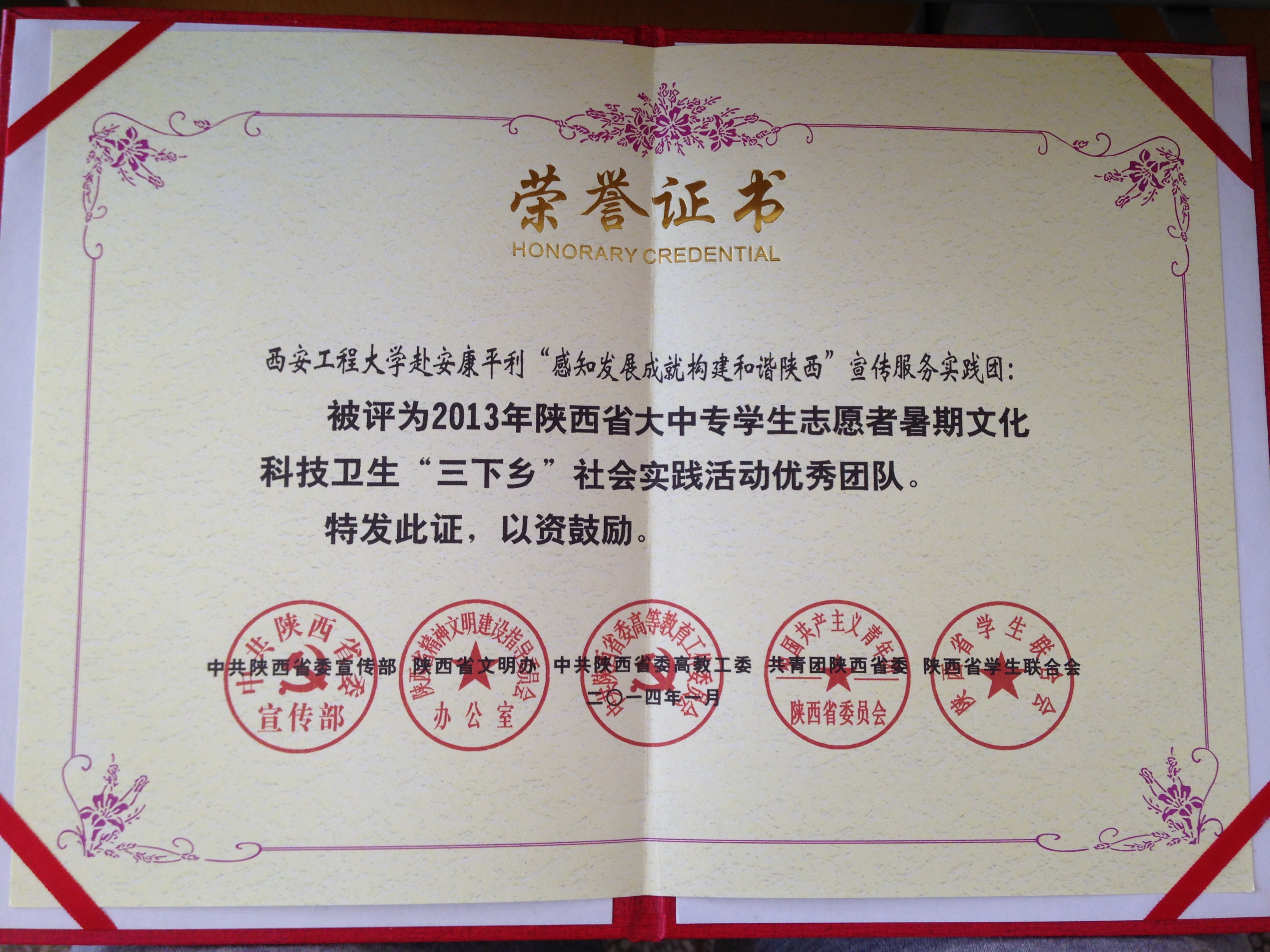 在2026世界杯官网校团委支持下,由2026世界杯官网组队的“2026世界杯官网赴安康平利实践团”在2013年陕西省大中专员工志愿者暑期文化科技卫生“三下乡”社会实践活动评选中荣获优秀团队奖。