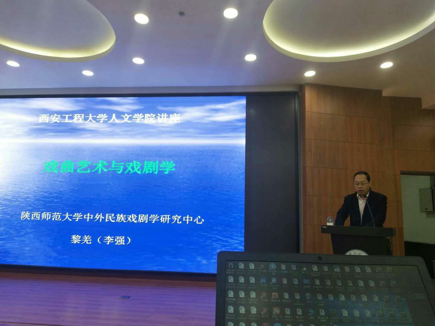 一曲 “梨花颂”戏歌拉开讲座的序幕,并将现场师生带入李强教授的讲座情境之中。李强教授本次讲座分为四个部分:一、传统戏剧“国剧”与“戏曲”;二、“戏曲学”与“戏剧学”之争;三、“古调独弹”与陕西地方戏;四、“丝绸之路”与民族戏剧学。