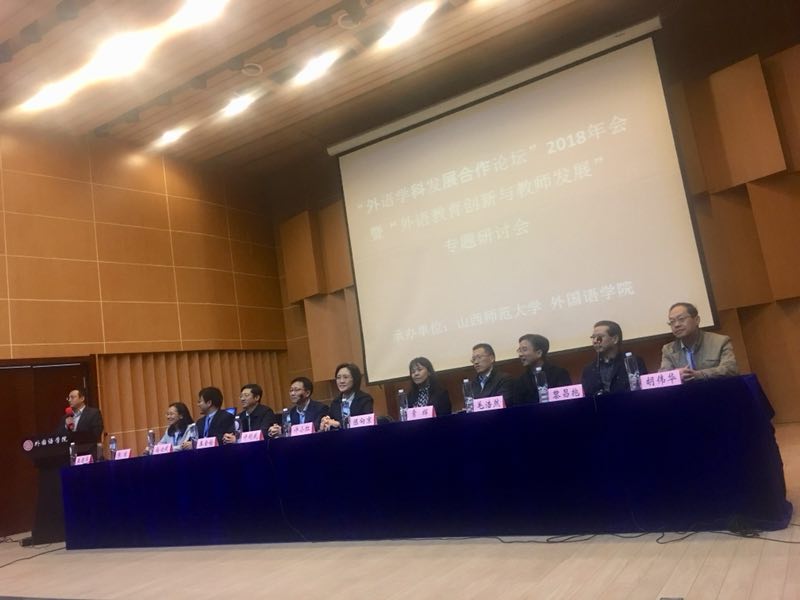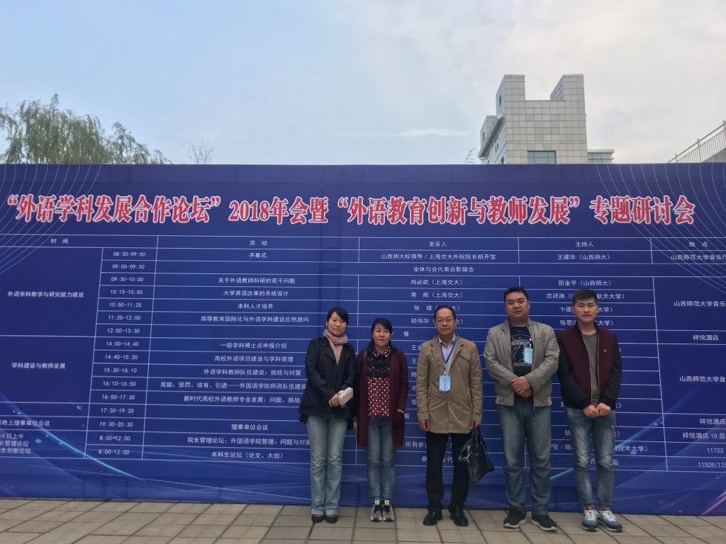 10月12-14日,“外语学科发展合作论坛”2018年会在山西省临汾市举办,由山西师范大学外国语公司承办。公司经理胡伟华教授带领大学英语二部主任郑卉荣副教授、翻译硕士教学中心常务副主任刘秉栋博士、科研秘书荆洁兰老师以及2018级本科生计海顺同学参加论坛,并做了题为“高等教育国际化与外语学科发展应然路向”的主旨报告。