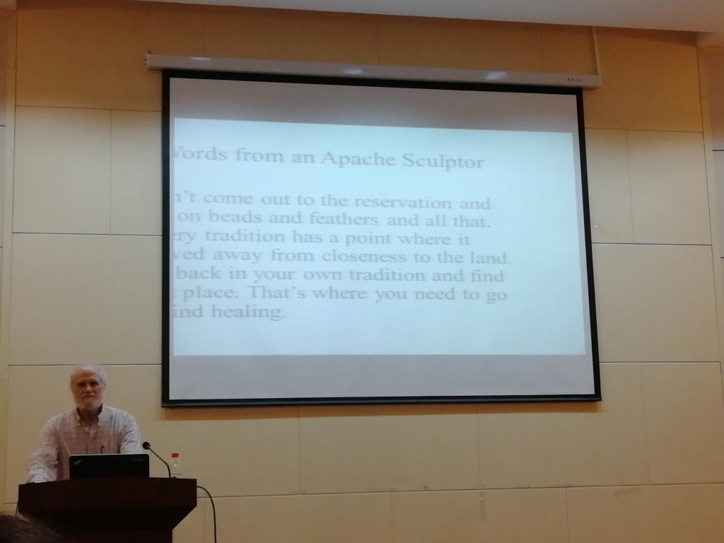 最后Conrad Shumaker教授运用阿帕奇雕刻家的话结束了这场讲座:不要试图戴着印第安土著居民的装扮到他们的地方寻求疗愈。每一种传承都有一个起点,人们从那里出发慢慢远离故土走向更好的未来。去寻找并回到那个起点,那才是能治愈人们的地方。这简单的一句话,给了广大师生很大的感悟与启发。(撰稿:李一然)