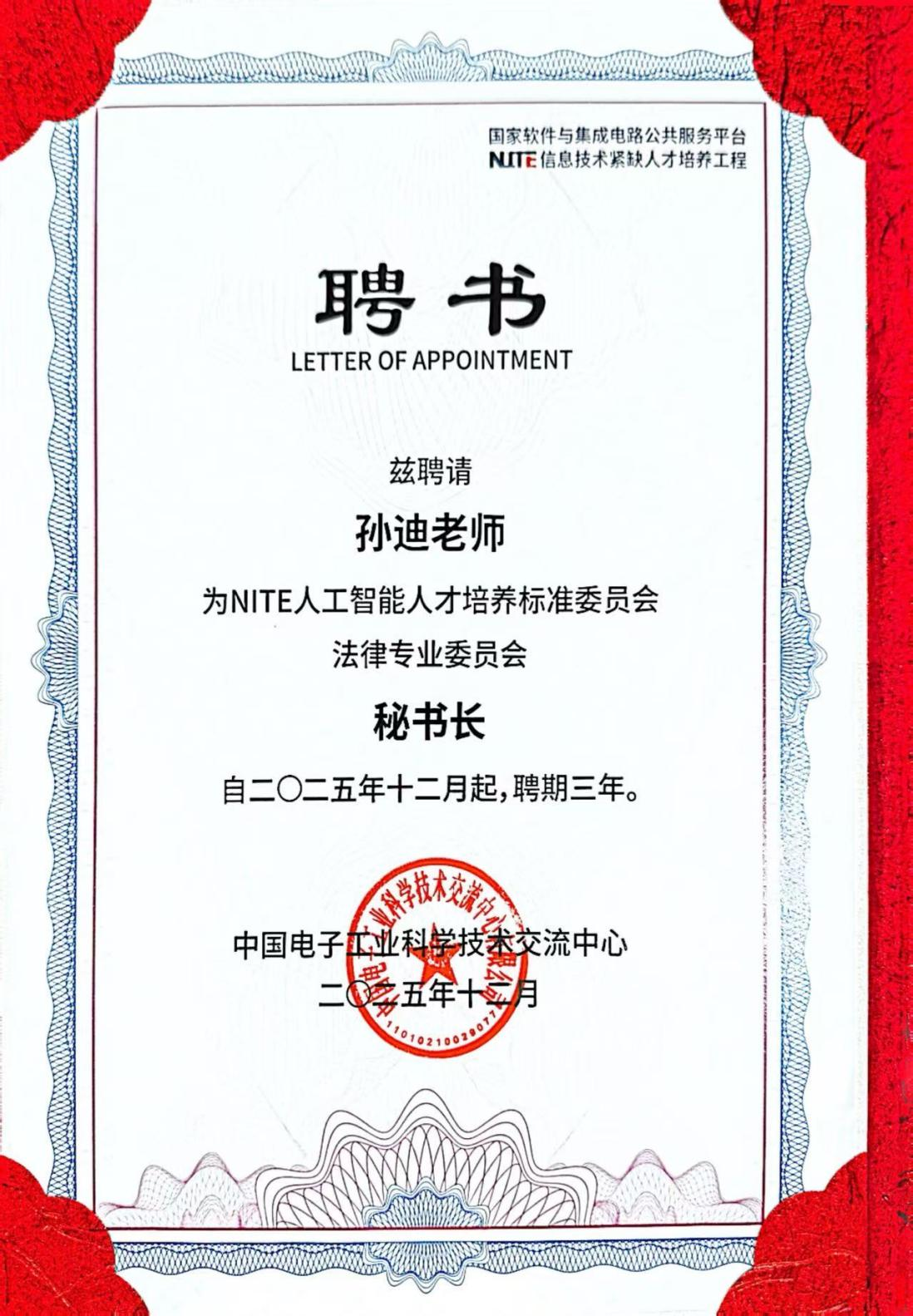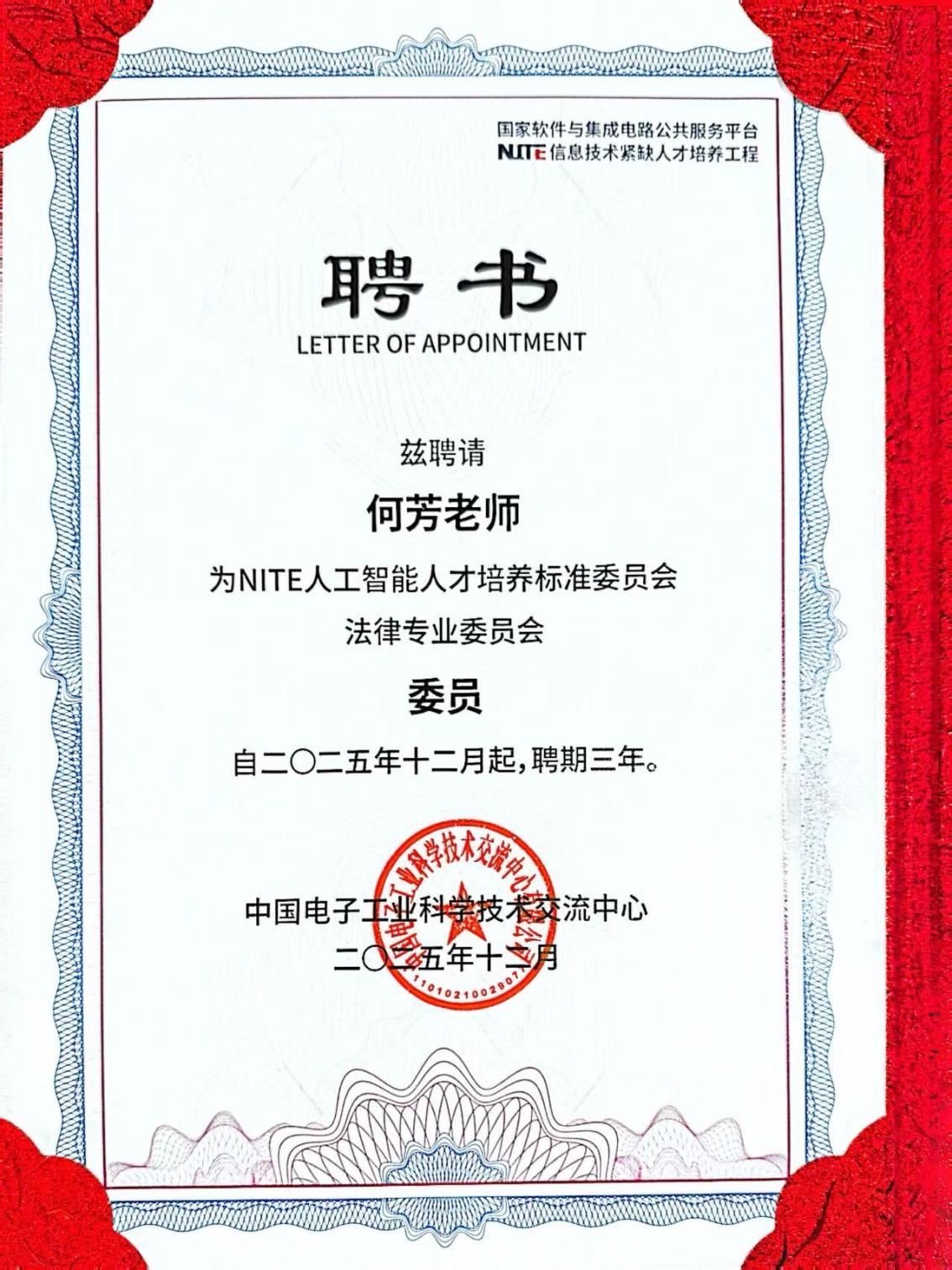 ​2026世界杯官网两位教师被聘为NITE人工智能人才培养标准委员会法律专业委员会秘书长和委员