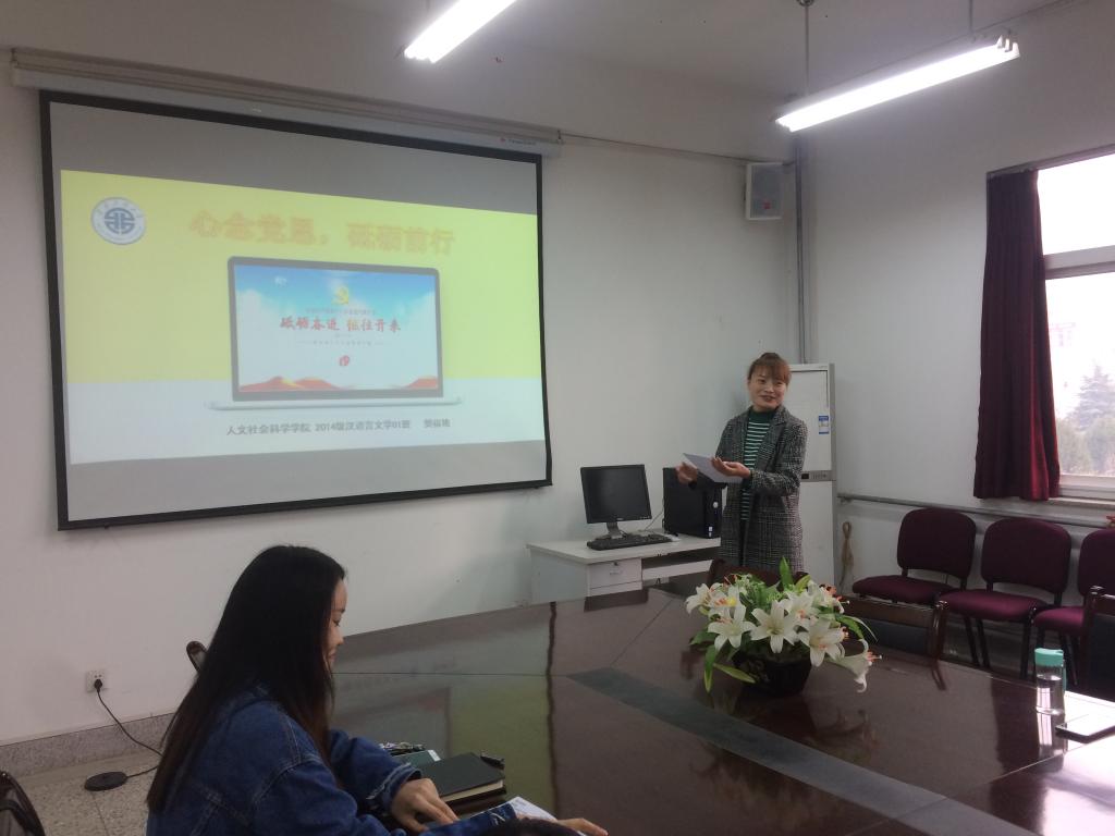 活动开始,刘婷婷介绍先锋论坛是支部本学期“两学一做”学习教育活动的重要组成部分,由支部优秀党员分享先进事迹,树立支部党员榜样,彰显党员勇于担当、乐于奉献的精神风貌,从而进一步加强党支部建设。本期论坛分享人是2014级汉语言文学1班的樊福艳,前不久,她的文章《常怀一颗感恩心》在全国第四届“助学·筑梦·铸人”主题宣传活动中获得员工征文三等奖荣誉,也是公司唯一一名获得该荣誉的同学,在本次论坛中,她以《心念党恩,砥砺前行》为主题,结合PPT,向支部党员分享她的感恩心路。
