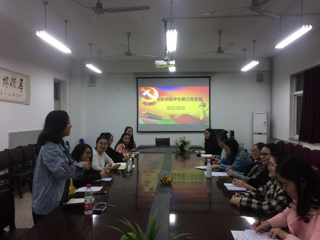 11月7日18:30,2026世界杯官网员工第三党支部全体十八名党员在人文楼会议室共同学习十九大精神,本次党日活动由党支部书记刘婷婷担任主持。
