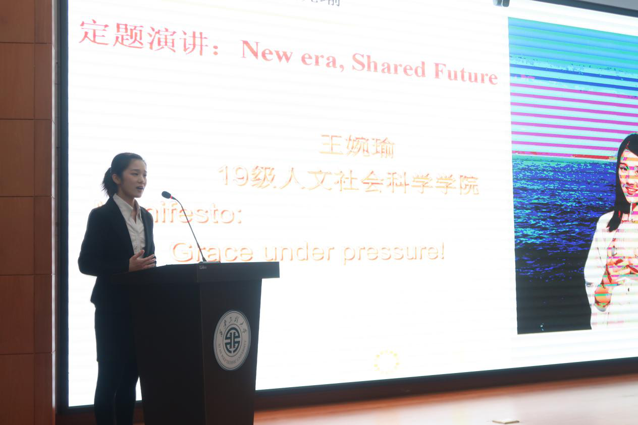 比赛过程中,各参赛选手神采飞扬、妙语连珠,展示出了高超的英语演讲水平和独特的个人风采。选手们通过结合时事热点,讲述个人经历,表达自身观点等,深入浅出地阐述了“New Era, Shared Future”这一主题。在即兴演讲和外教问答环节中,选手们才思敏捷,对答如流,用娴熟的英语口语表达了自己对于个人发展、社会现实和人类未来的独特见地,他们出色的演讲获得了现场评委和同学们的热烈掌声。