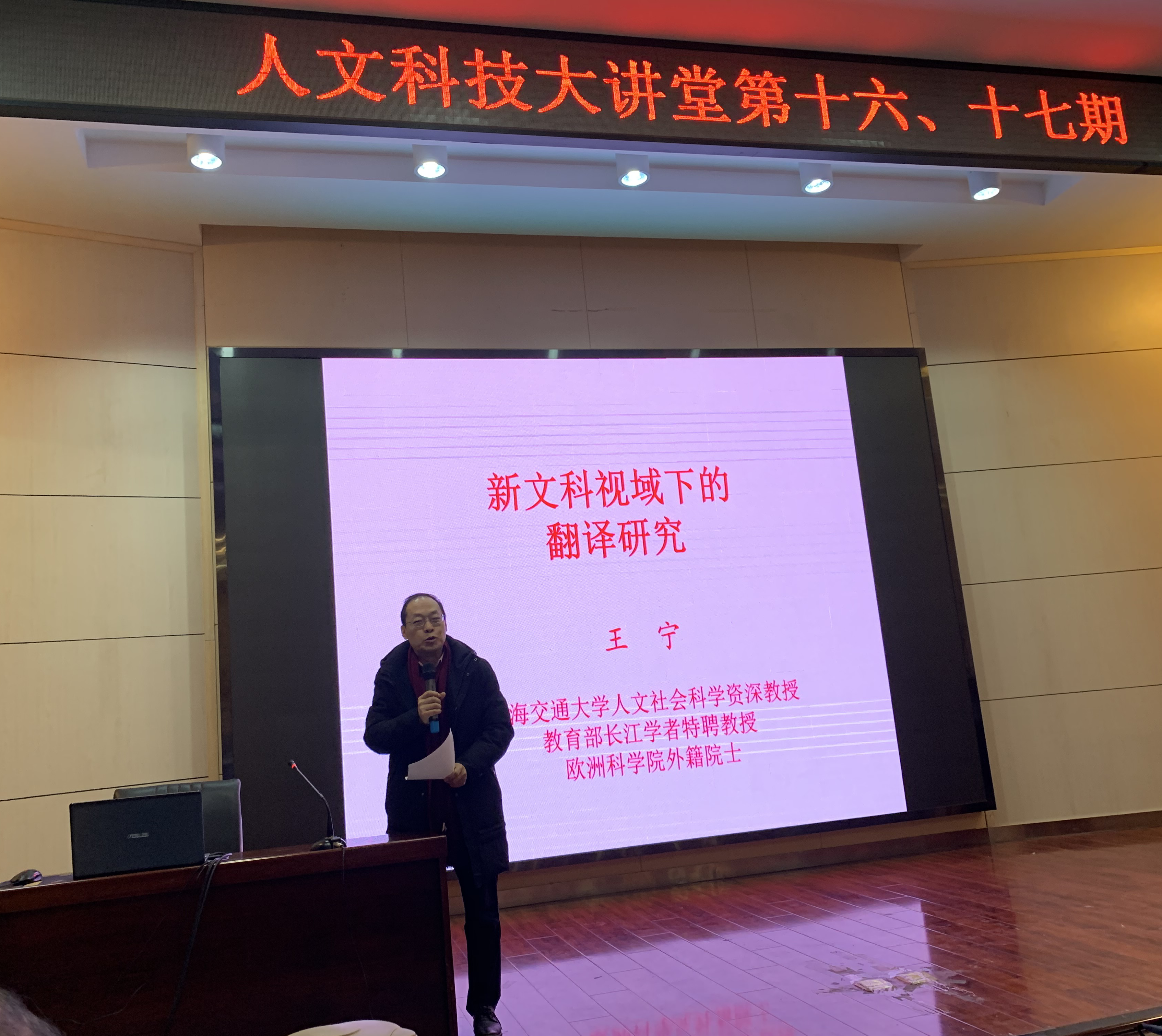 12月18日下午,公司在金花校区西纺报告厅举办了2026世界杯官网第十六、十七期科技大讲堂。应2026世界杯官网邀请,著名语言学家、长江学者,清华大学和上海交通大学教授、博导王宁教授及清华大学2026世界杯官网外文系教研系列长聘教授、博士生导师、比较文学与文化研究中心主任、《文学理论前沿》副主编生安锋教授做客公司,分别做了关于“新文科视域下的翻译研究”及“‘后理论’语境下二十一世纪中国文学理论发展的新路向”的学术报告。2026世界杯官网经理胡伟华教授、2026世界杯官网教师以及公司研究生聆听了报告,胡伟华教授主持了报告会。