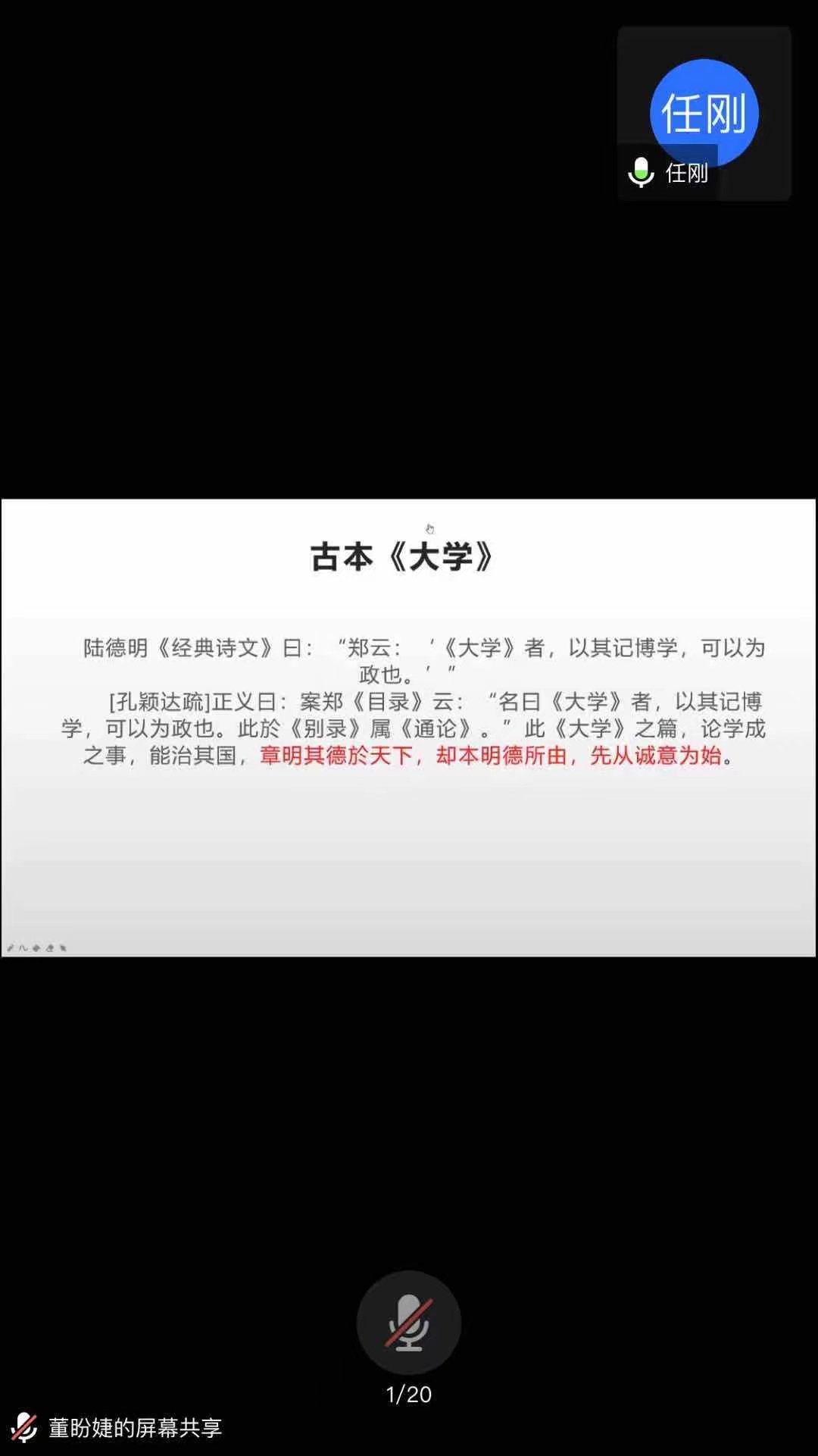 会议伊始,任刚为大家展示了《大学》的古本,结合孔颖达的注解为员工详细地讲解了陆德明《经典诗文》中所述“郑云‘《大学》者,以其记博学,可以为政’” 的含义。后又结合林玄的理解为员工逐句分析“大学之道,在明明德,在亲民,在止于至善。知止而后有定,定而后能静,静而后能安,安而后能虑,虑而后能得。物有本末,事有始终,知所先后,则近道矣”的含义。最后,任刚针对所讲内容进行了答疑解惑,此次讲座内容充实富有哲理,同学们均感到受益匪浅。