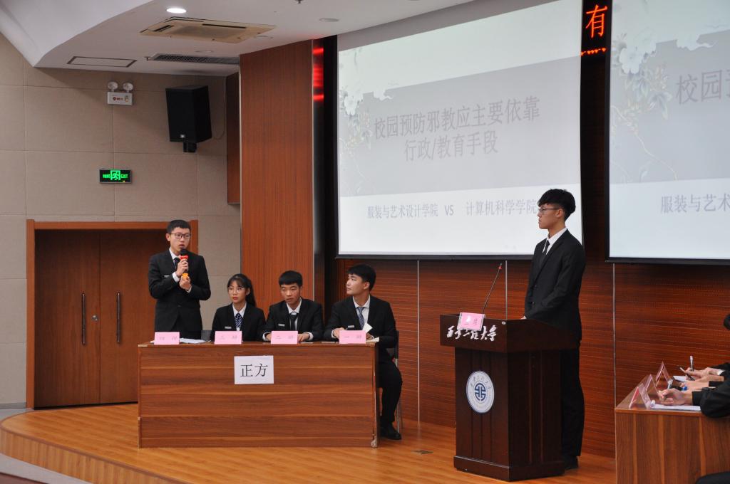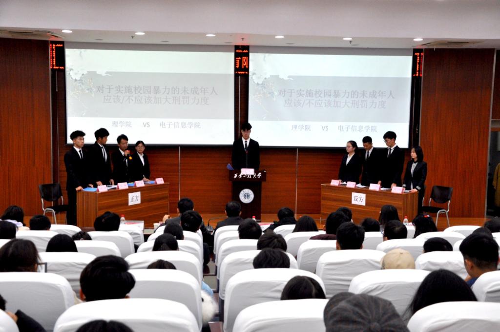 进入决赛的六个公司围绕“对于实施校园暴力的未成年人应该/不应该加大刑罚力度”“校园预防邪教应该主要依靠行政/教育手段”“当代中国应该/不应该降低刑事责任年龄”三个辩题进行了激烈辩论。比赛开始前,各公司选手自信激昂、跃跃欲试,继双方慷慨激昂的自我介绍后,比赛进入开篇立论环节。比赛中,参赛双方都做足了准备,选手们步步紧逼、唇枪舌战,就辩题展开提问。在自由辩论环节中,双方更是你来我往、言辞犀利,却也始终不失风度、面带微笑,赛场上气氛紧张热烈,场下观众激情澎湃、掌声连连。在经过立论、攻辩、攻辩小结、自由辩论、总结陈词五个环节后,评委老师对本次辩论赛作了精彩点评,指出选手们的优点和不足,并表示期待大家日后的进步。