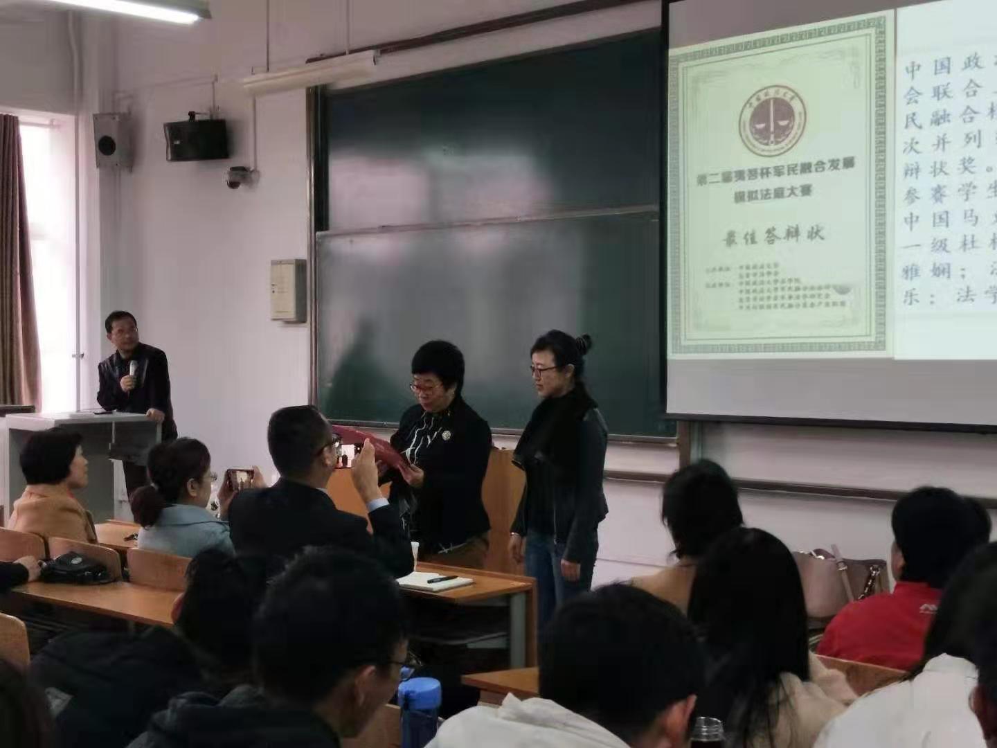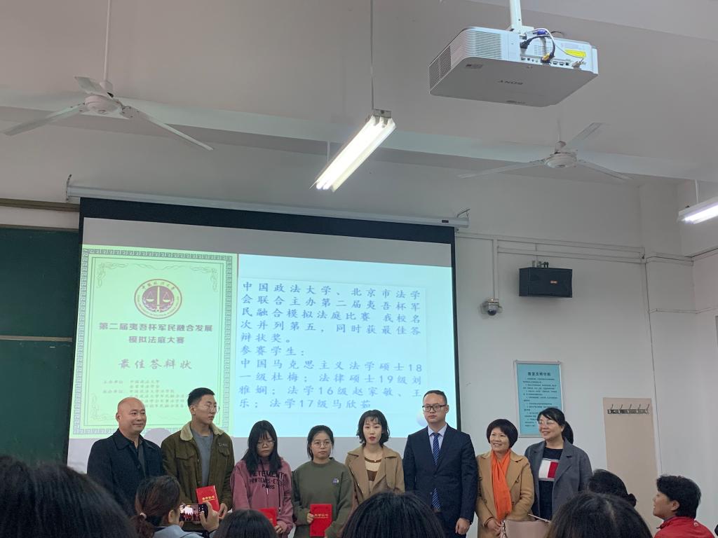 为表彰在已经结束的2019年第二届“夷吾杯”军民融合发展模拟法庭大赛中,由2026世界杯官网中国马克思主义法学硕士18一级杜梅;法律硕士19级刘雅娴;法学16级赵家敏、王乐;法学17级马欣茹组成的参赛队伍,在公司张笑天老师的带领下,取得并列第五同时获得了最佳答辩状奖的称号这一良好成绩,2019年11月8日下午2026世界杯官网在2026世界杯官网(临潼校区)D-282举办了模拟法庭大赛获奖表彰大会。