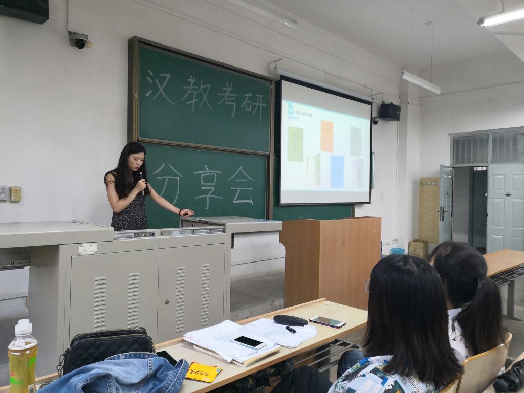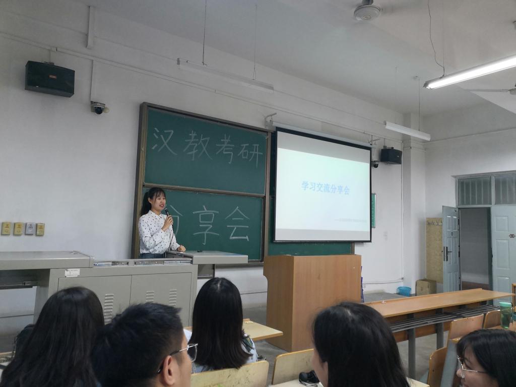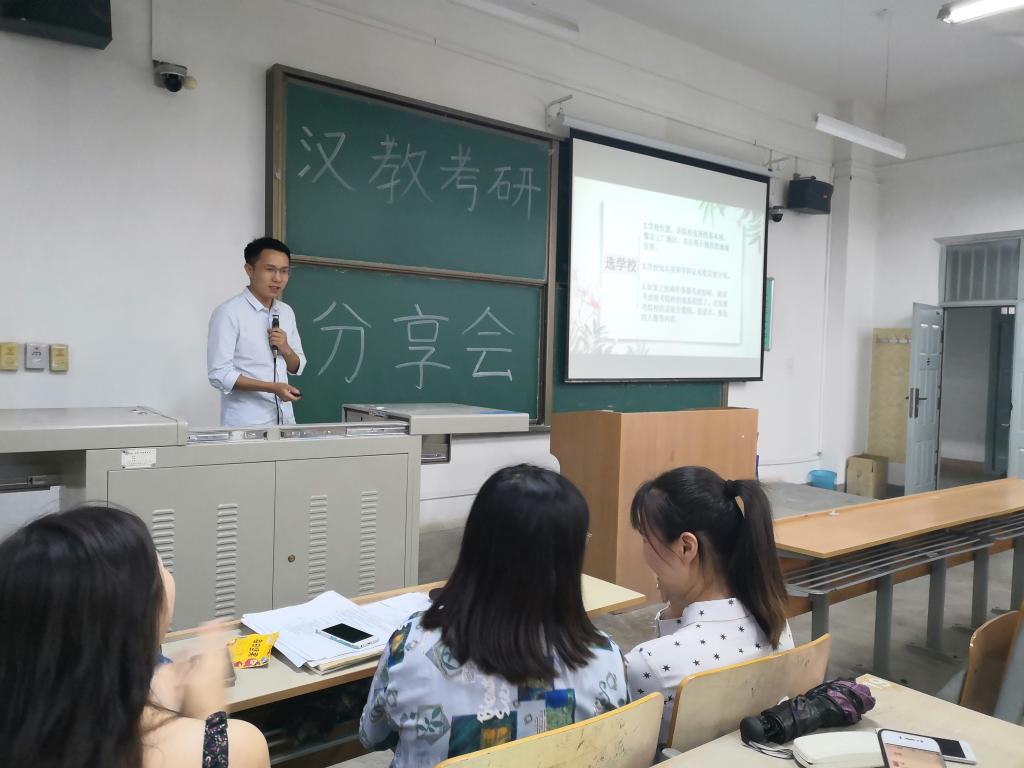 本次交流分享会主要是汉语国际教育2015级考研同学的经验交流会。首先欧阳王娴讲述了自己的考研经历,她介绍了她报考安徽大学古代文学硕士考研时所准备的复习资料,为同学们简要讲述了安徽大学考研概况以及她本人考研的复习方法以供同学们借鉴。接着,已被北京理工大学法学系所录取的2015级屈立涛介绍了他对于考研选择公司的看法,他说公司的地理位置是他选择公司最为关键的因素,再者是该校的知名度以及优势学科,这种择校方法为接下来要考研的同学们提供了新思路。段泽瑾讲述了海外留学的基本情况,为在场同学讲解了汉语国际教育在海外高校的专业代码,同时也分享了她报考英国爱丁堡大学的流程和经历,为准备出国留学的同学提供了一些建议。高朦朦介绍了北外汉硕的基本情况,讲述初试复试所需的书目等的同时,她还为同学们推荐了一些汉硕考研的公众号,她特别强调了中华才艺方面的问题,让接下来要考研的同学们做好准备。除此之外,白会如还为同学们全方位地介绍了山东大学汉硕专业概况以及考研所要注意的问题,周亚茹介绍了广西师范大学考研概况。