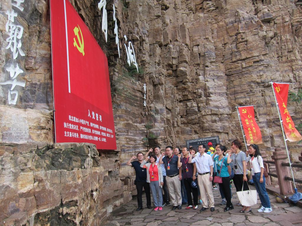 参观红旗渠主干渠时,大家走在紧贴山崖凌空而建的栈道上,步行的艰难让学员们真切体会到当年施工的难度,感叹当年修建红旗渠的艰辛和不易。红旗渠所展现的辉煌和气势让党员同志们震撼不已,当年林县人民不屈不挠的革命意志和战天斗地的英雄气概,深深洗涤了党员们的灵魂。在主干渠的咽喉工程--青年洞旁,全体党员举起右拳,面向党旗庄严宣誓,铮铮声响在山谷间久久回荡。