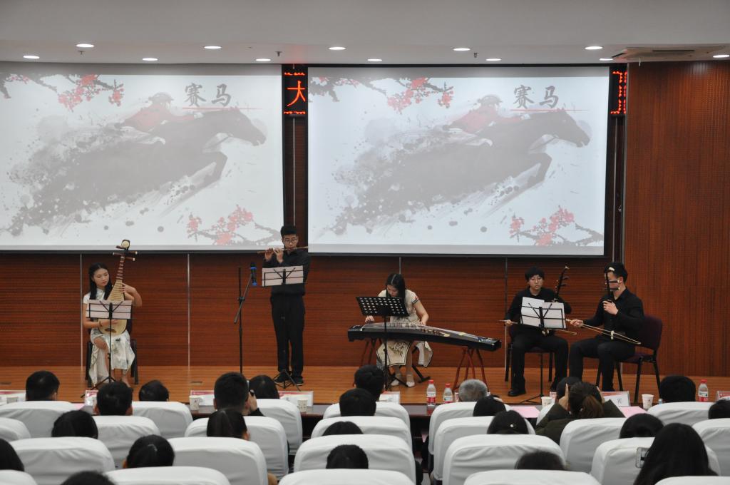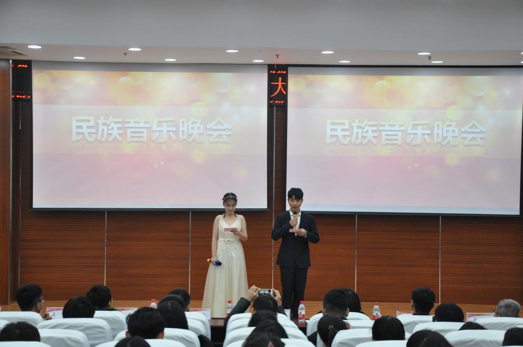 表彰大会结束后,一曲古筝独奏《渔舟唱晚》拉开了本次民族音乐会的帷幕。民乐合奏《苏堤漫步》和《茉莉花》曲调清秀温婉、优美抒情,给人以美的艺术享受;葫芦丝独奏《竹林深处》将观众带向了高山流水的至美境界;女生独唱《为了谁》、民乐合奏《春江花月夜》、《赛马》轮番上演,赢得观众阵阵掌声;更有2017级辅导员刘杨扬和邢烜毓带来的《骏马奔驰保边疆》以其磅礴的气势、奔放的旋律将晚会气氛推向高潮。演奏过程中,表演者以合奏、独奏、独唱等形式展现了二胡、竹笛等多种民族乐器及民族声乐的魅力,为观众带来一场震撼的视听、听觉盛宴,充分体现了中华民族音乐文化的博大精深。