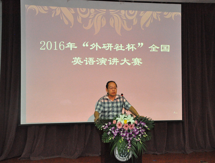 大赛开始前,主持人就参赛流程及奖项设置作了简要说明。随后,员工工作部(处)副处长臧国强为本次大赛致辞。他谈到,“外研社杯”系列大赛是全国参赛人数最多、规模最大、水平最高的英语赛事,希望通过本次大赛开展激发同学们对英语的学习兴趣,提高同学们的英语水平,以达到丰富校园文化生活,增强学术研讨氛围的目的。