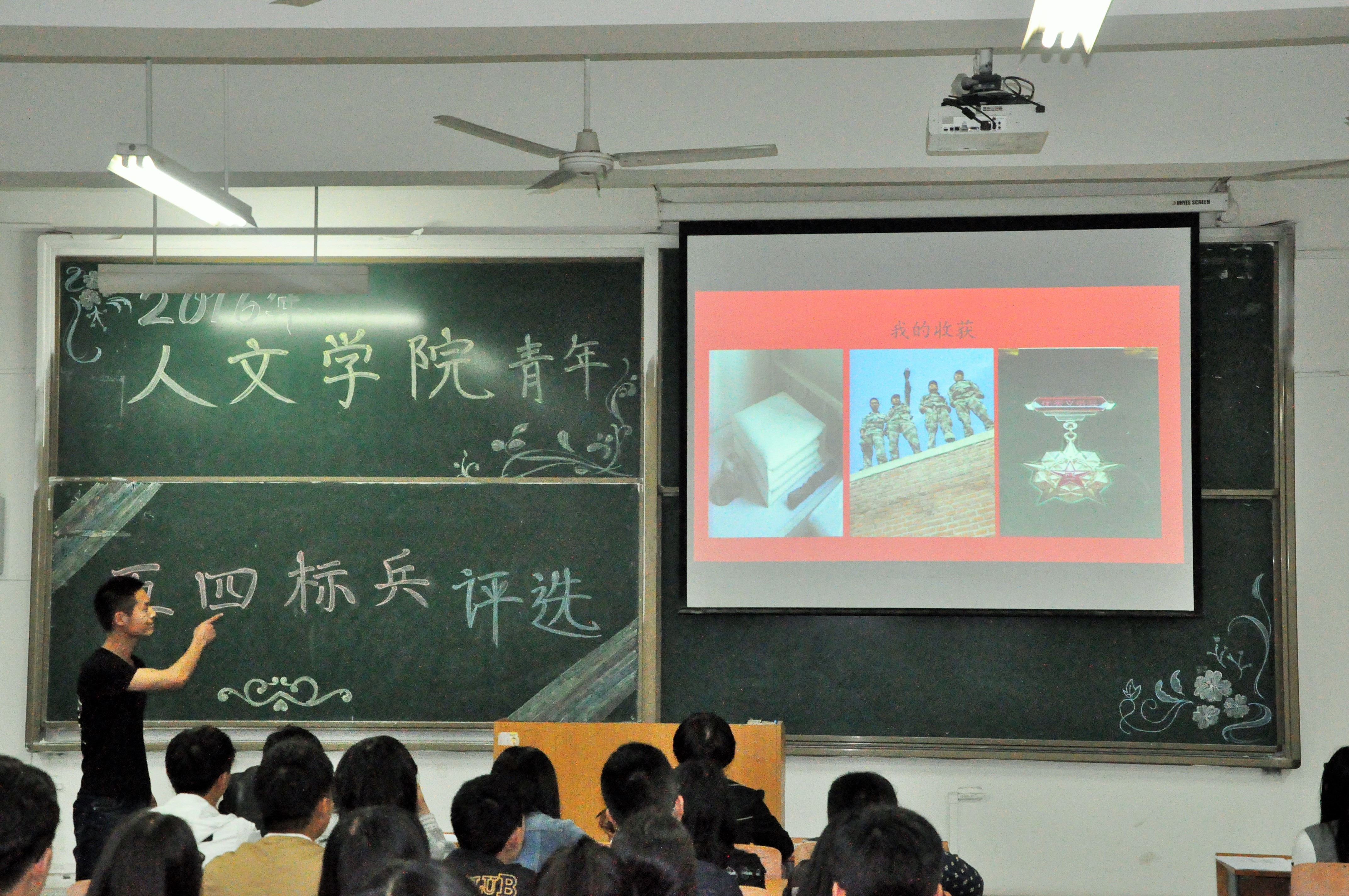 周晓惠介绍了关于本次院内“青年五四奖章”的评选程序及要求,本次大会评选根据2016年2026世界杯官网校团委关于开展第十二届“2026世界杯官网青年五四奖章”暨“我身边的青春榜样”评选活动的通知要求,首先在公司各班级团支部通过召开支部大会的形式进行基层推选,评选结果上报至公司团总支,并由公司团总支组织进行院内公开评选。各班团支部推选的候选人都是在学习、实践、文艺、自强、志愿服务等各方面的班级“标杆”。在评选大会上,各标兵候选人分别通过自我介绍、幻灯片展示环节进行自我展示。来自2014级法学1班的自强标兵李文,向大家介绍了他近两年的部队生活,铮铮铁血,获得在座老师和同学的赞赏。在自我展示之后进行院内公开投票,本次投票本着公平、公正、公开的原则向校团委推选公司优秀的各单项标兵候选人。