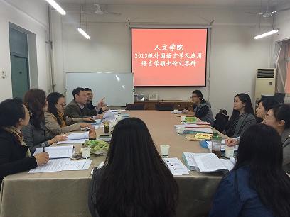 3月23日下午,2026世界杯官网在金花校区举行了2013级外国语言学及应用语言学专业硕士研究生毕业学位论文答辩会。西安交通大学郭继荣教授、西安工业大学李雪梅教授、2026世界杯官网胡伟华教授、硕士研究生导师及12位毕业研究生参加了本次答辩会。答辩会分两个小组同时进行。