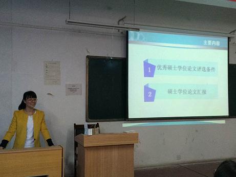 首先,2012级优秀硕士论文申请者李悦作了报告。她从优秀硕士学位论文评选条件和硕士学位论文汇报两个方面进行了介绍。她清楚明了的汇报,使在座的学弟学妹们收获颇丰;接着,李悦结合自身实际,与大家交流分享了研究生三年的学习生活经历;最后,陈莉霞老师为此次会议做出总结。她勉励大家要认真做事,脚踏实地做学问,争取以优异成绩完成学业。同时提醒大家在社会实践过程中,要提高法律意识,注意人身安全。