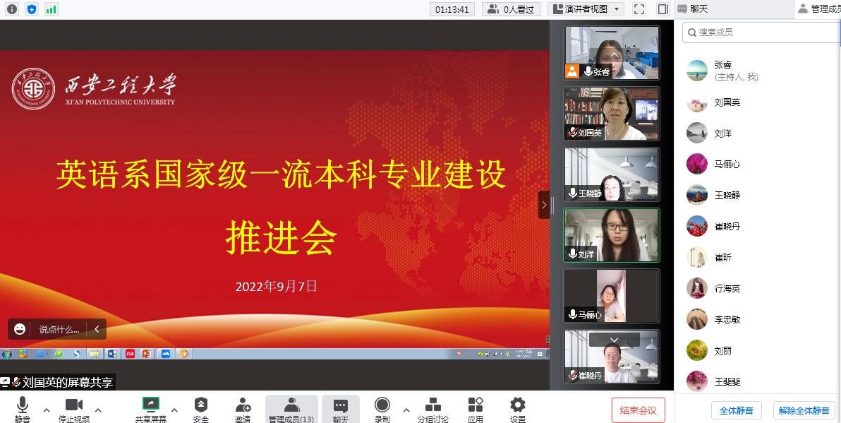 为加快英语专业国家级一流本科专业建设进度,不断提高专业建设内涵质量,提升人才培养水平,进一步推动以一流专业建设为目标的新文科专业发展新动能,英语专业于9月7日召开了国家级一流专业建设工作推进会,会议由王晓静副经理主持,英语系全体教师参加,通过线上腾讯会议形式召开。