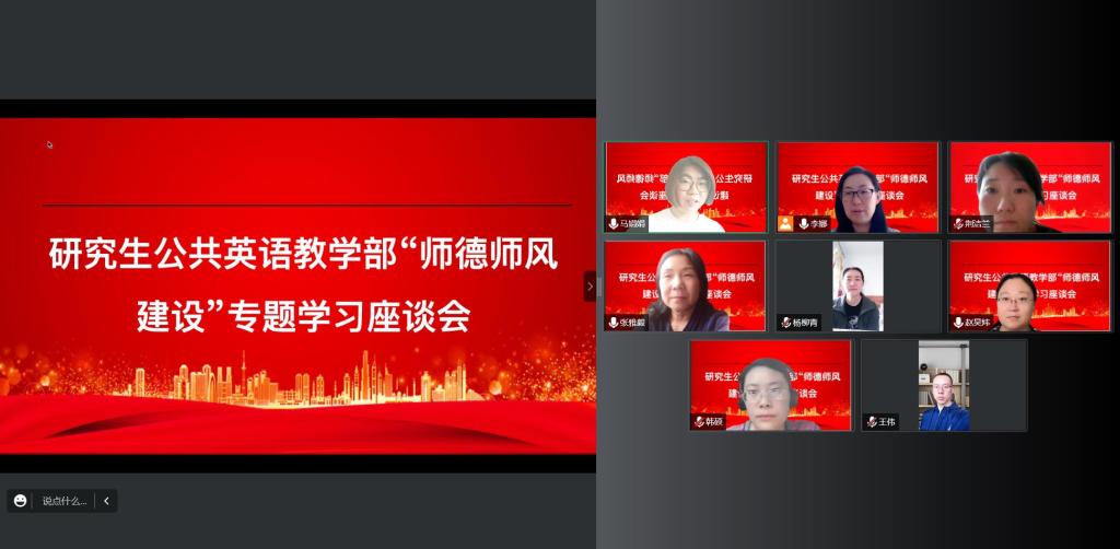 为贯彻落实公司部署和要求,强化党建引领新时代教师队伍建设,持续加强师德师风建设,2022年9月26日,研究生公共英语教学部通过线上形式开展“师德师风建设”专题学习座谈会。座谈会由教学部主任李娜老师主持,部门全体教师参加了座谈会。