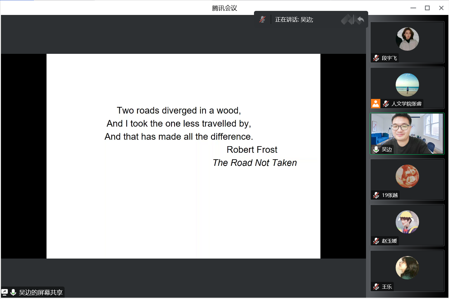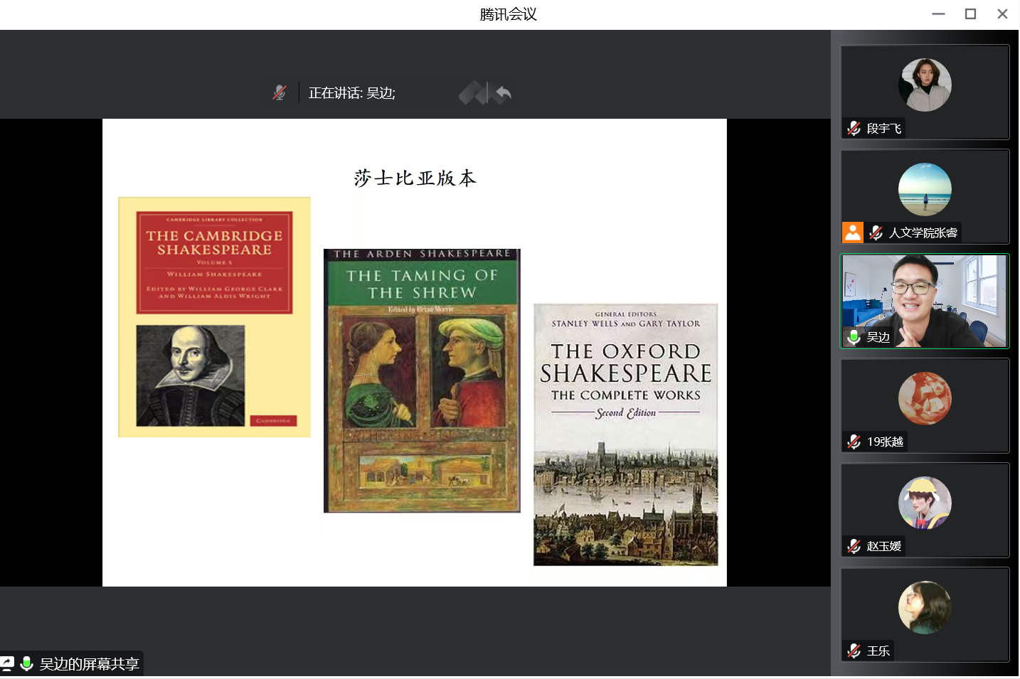 吴老师对自己的简介为:一介书生,四海逐梦;将对母校的感情表示为:饮水思源,恩情难忘;把语言学习技巧归纳为:“五功四法”、勤加练习;在考学方面对同学们的建议为:选好方向、切实考量;在科研方面的心得为:耐住寂寞、守住繁华;对翻译学习的体悟为:译生有崖,译海无崖。吴老师对莎士比亚的作品研究颇深,在会上,他还向同学们分享了在研究莎士比亚及其文学作品的过程中遇到的些许“趣事”和研究思路。
