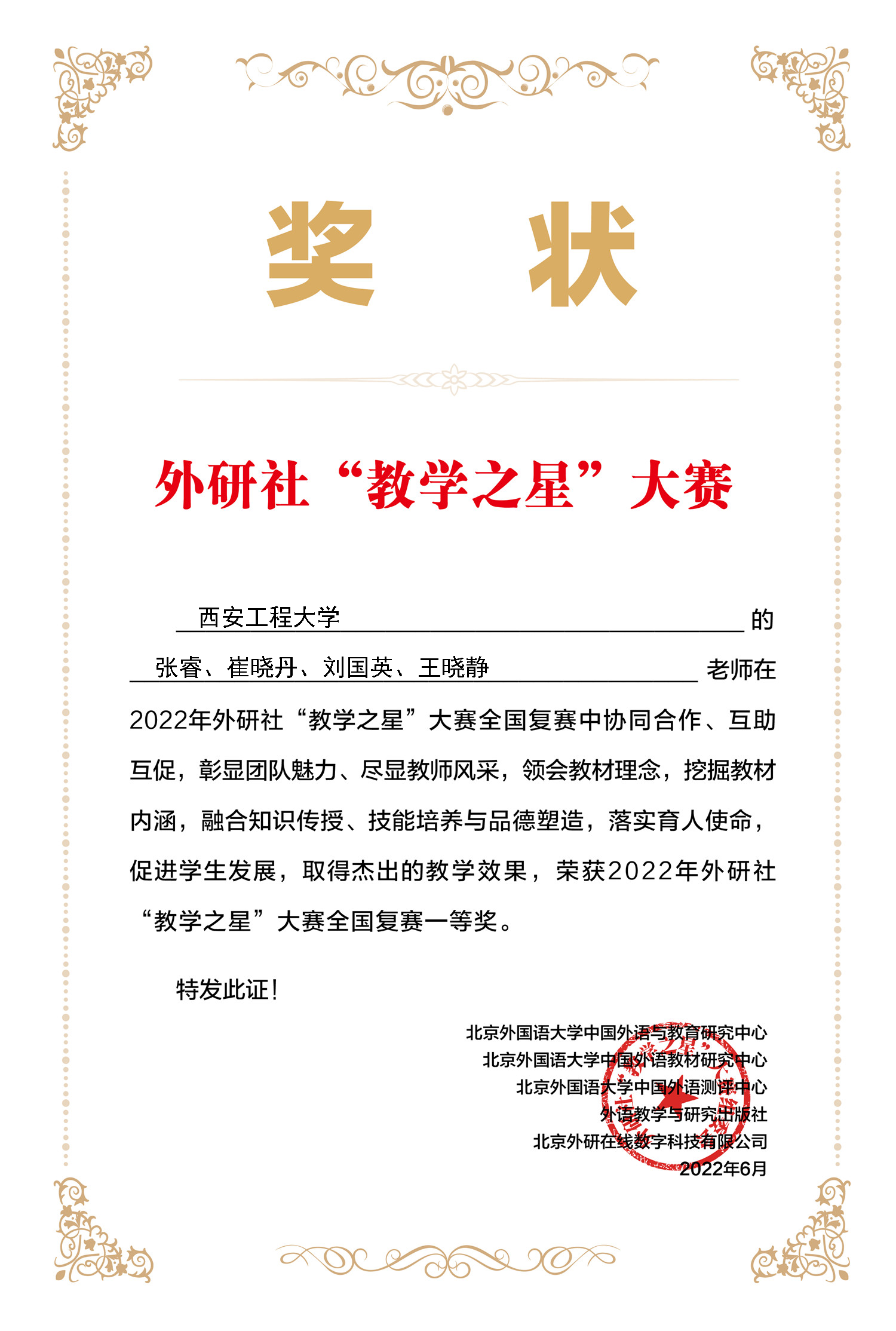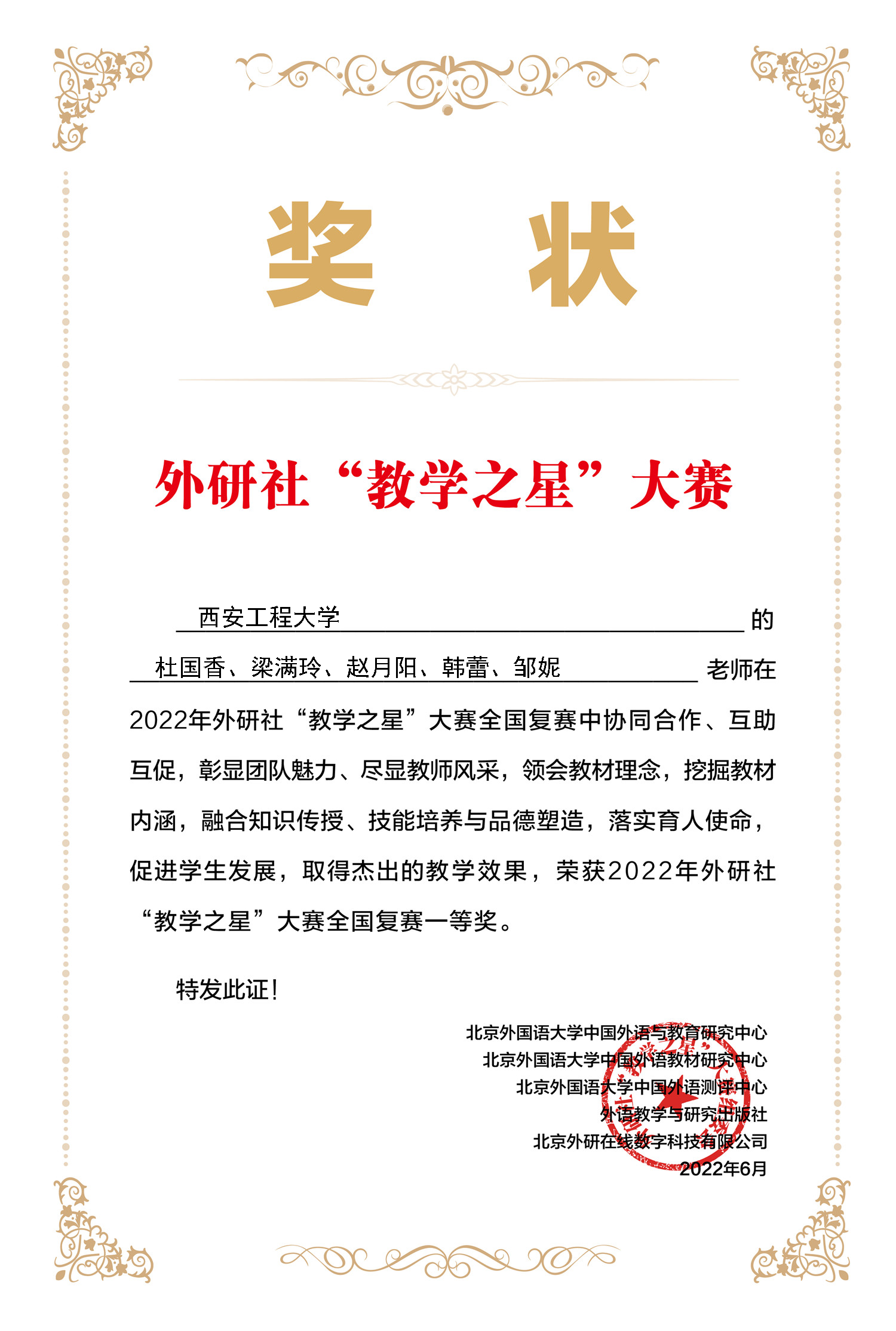 外研社“教学之星”大赛创办于2013年,是由教育部高等公司大学外语教学指导委员会、教育部高等公司英语专业教学指导分委员会、外语教学与研究出版社共同主办,面向全国高等院校外语教师的大型赛事。2022年的大赛以“外语教材的有效使用:思想性与科学性相统一”为主题,共吸引了全国各高校共569个教学团队约2500名教师参赛。公司两支参赛团队紧紧围绕大赛主题,紧扣时代脉搏,以知识传授、能力培养和价值引领三位一体的原则为指导,以“两性一度”课程标准为牵引,分别从“教案设计”“全英文说课”“课堂展示”三个环节,凭借立意新颖且结构合理的课程设计、紧凑而有深度的课堂展现,斩获优异成绩。