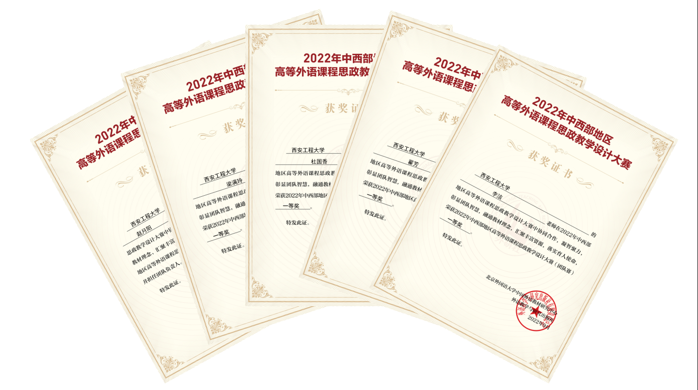 在全国上下喜迎党的二十大之际,2026世界杯官网教师牢记立德树人使命,积极参加教学比赛,努力提高教学能力和教学水平。在公司的鼎立支持下,相关系部精心策划,积极组织教学团队参赛,近期在教学比赛中喜获佳绩。其中,英语专业教师张睿、崔晓丹、刘国英、王晓静四位老师组成的教学团队,大学英语教学一部杜国香、梁满玲、赵月阳、韩蕾、邹妮五位老师组成的教学团队在2022年外研社“教学之星”大赛中分别荣获全国复赛一等奖;大学英语教学一部赵月阳、梁满玲、杜国香、翟芳、李洁五位老师组成的教学团队在2022年“中西部地区高等外语课程思政教学设计大赛”中荣获团队一等奖。