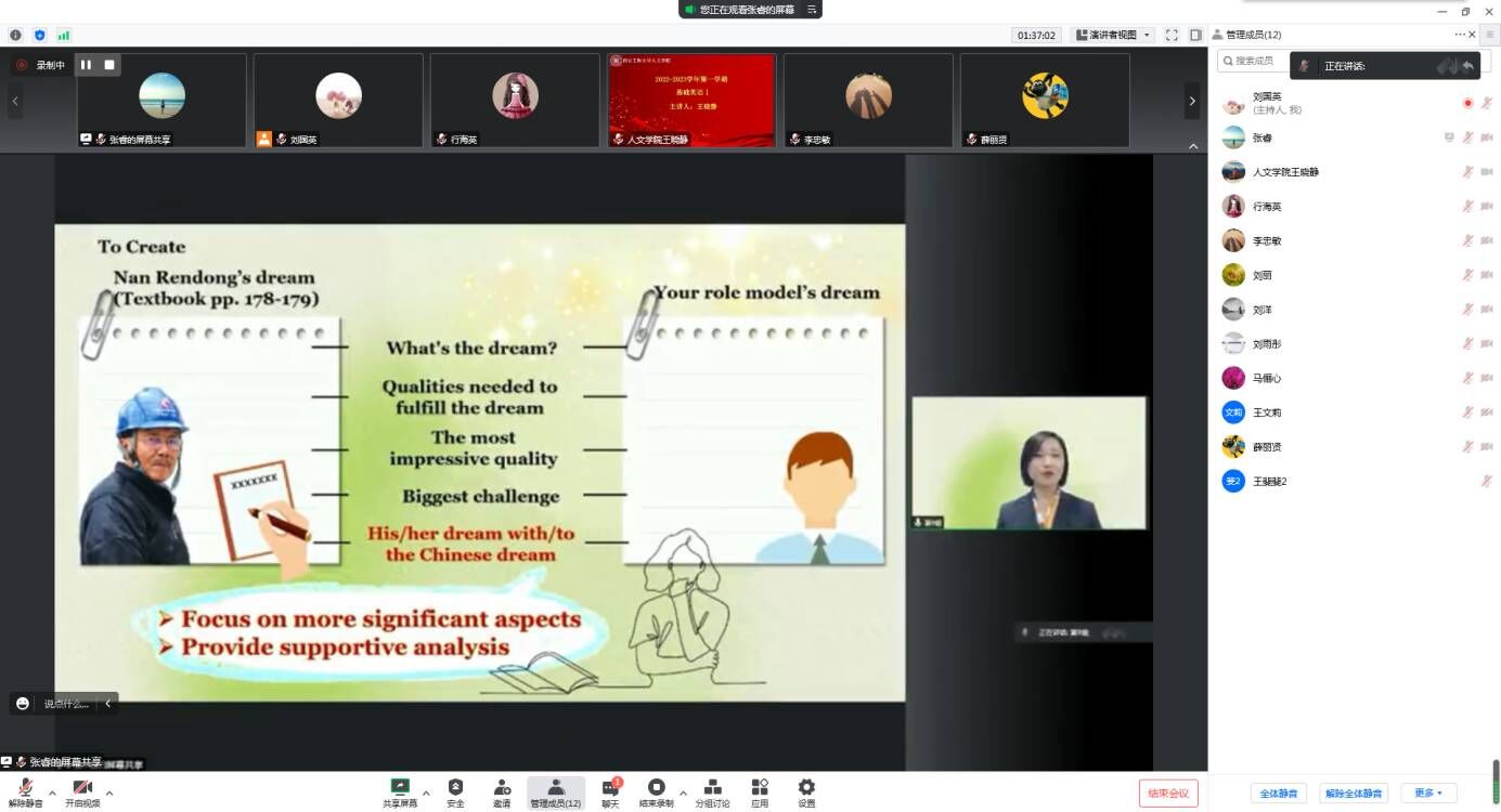 与会同时,为进一步提高授课质量、促进教师间教学经验分享交流,英语系系主任张睿老师以自己所授课程为例进行了分享,介绍并讲解了自己的教学设计、教学方法、教学步骤。随后,导师团全体成员集体观看了2021年外研社“教学之星”大赛全国总决赛获奖的优质课,并开展了热烈的交流讨论及经验分享。大家一致认为:这些老师们的授课ppt内容详实生动、重点难点突出、教学方法合理,并且都很好的融入了思政元素,整个过程受益匪浅。