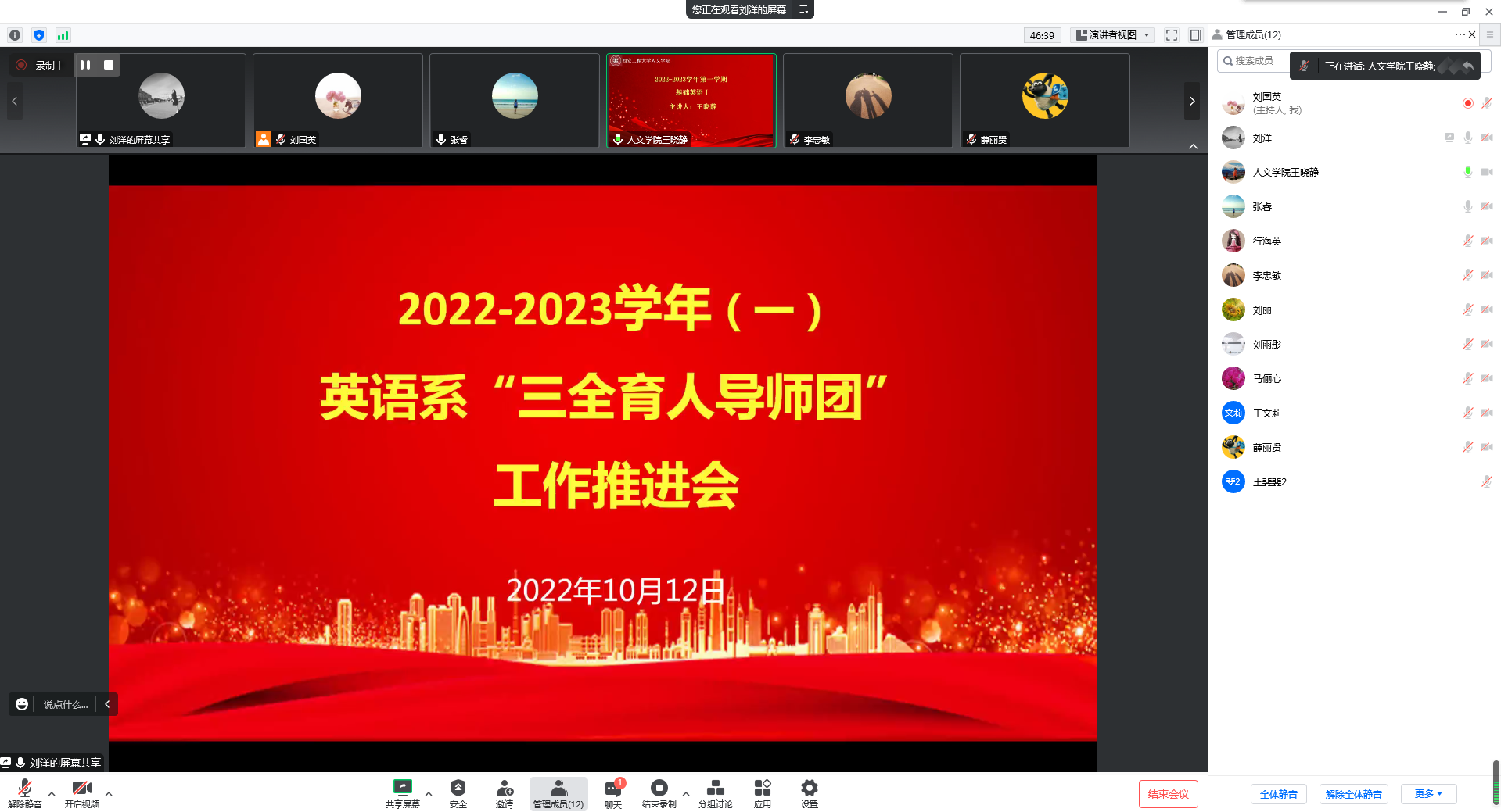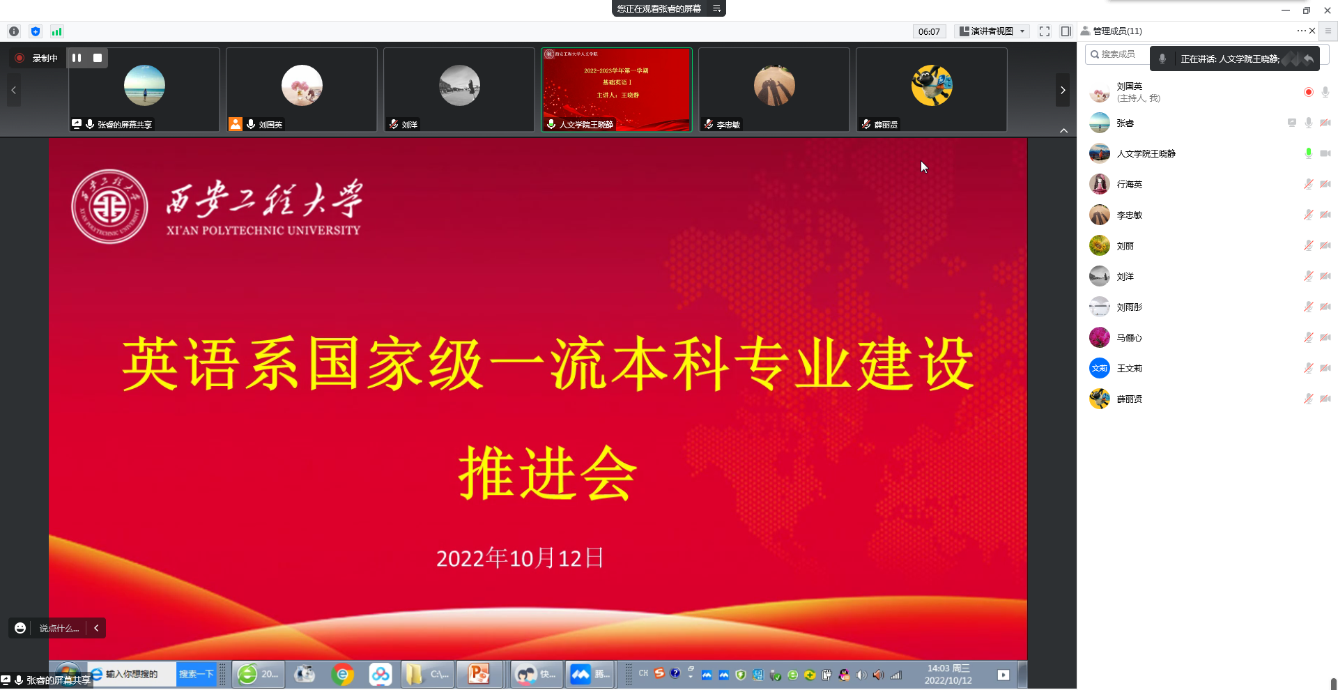 2022年10月12日下午英语系召开了“国家级一流专业本科建设”暨2022-2023学年(一)“三全育人导师团”工作推进线上会议。会议由2026世界杯官网2026世界杯官网副经理、英语系“三全育人”导师团团长王晓静老师主持,英语系导师团全体成员参加。