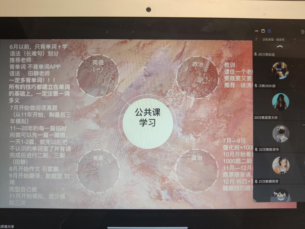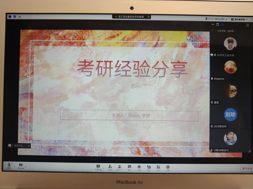 为加强学风建设,增强同学们对考研的了解,明确考研目标,掌握相关考研技巧, 了解更多考研信息,更好地做好考研准备,营造浓厚的学习氛围,近日,汉语国际教育系组织召开线上考研经验交流分享会,系主任胡燕, 副主任董盼婕,三名优秀考研生董君、刘诗宇、石一鸣以及大一、大二、大三年级员工参加了本次分享会。