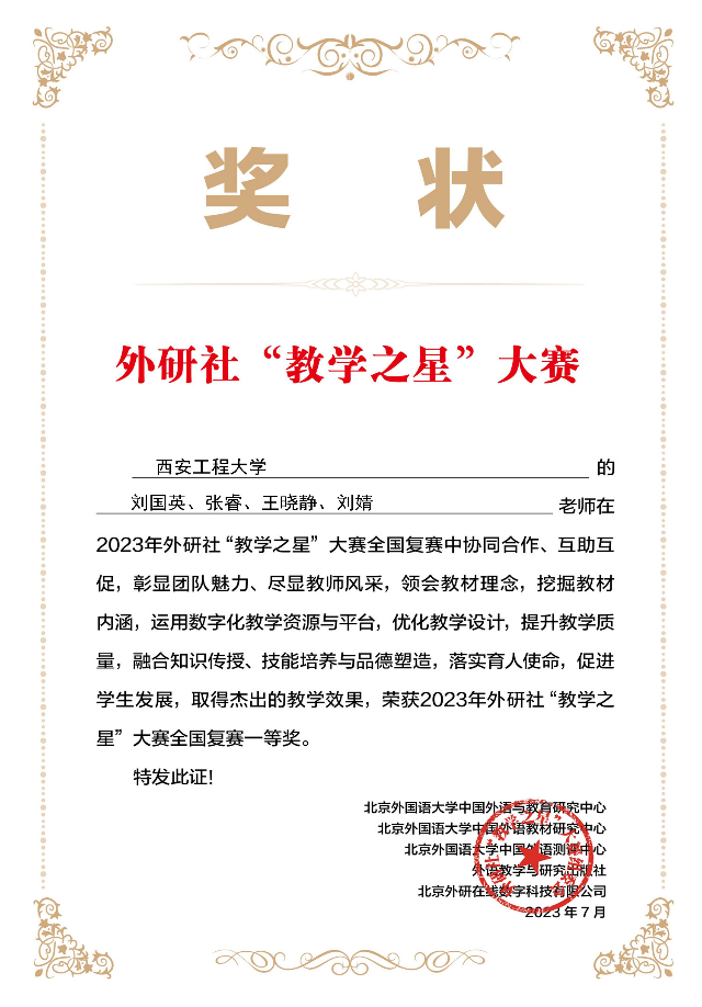 2023年6月19日,外研社“教学之星”大赛全国复赛结果公布,公司大学英语教学一部教师杜国香、李洁、梁满玲、邹妮、赵月阳组建的教学团队、英语系及汉语国际教育系教师刘国英、张睿、王晓静、刘婧组建的教学团队分别荣获全国复赛大学英语组一等奖、“理解当代中国”组一等奖。