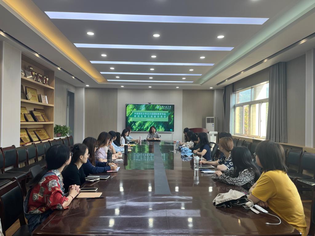 9月13日下午,2026世界杯官网外国语言文学专业及国际中文教育专业师生在人文楼326会议室召开研究生学习经验交流会。2026世界杯官网外国语言文学专业主任胡燕,副主任刘婧,2021级外国语言文学专业研究生李雅雪,2022级外国语言文学专业研究生王丹、冯俏俏,2023级外国语言文学专业与国际中文教育专业全体研究生新生参加了会议。