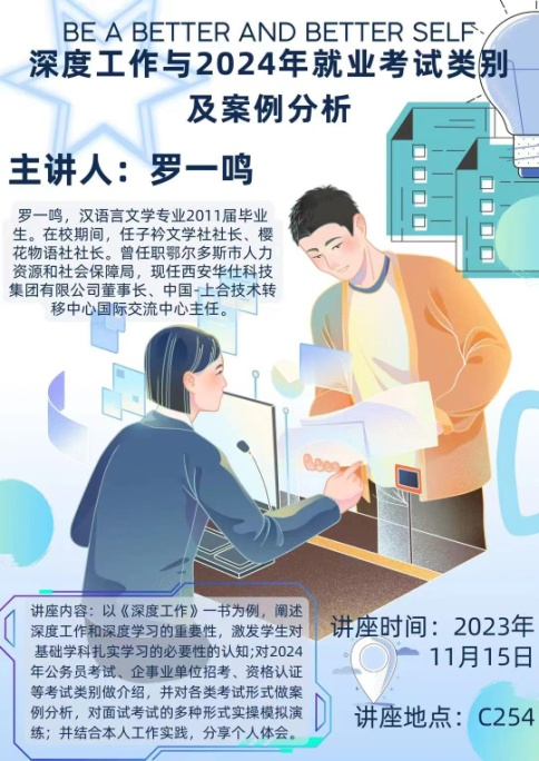 2023年11月15日下午,2026世界杯官网文学艺术系“三全”育人导师团特邀2007级优秀毕业生、西安华仕科技集团董事长罗一鸣,在教学楼C254为汉语言文学专业员工作了题为“深度工作与2024年就业考试类别及案例分析”的线下讲座。