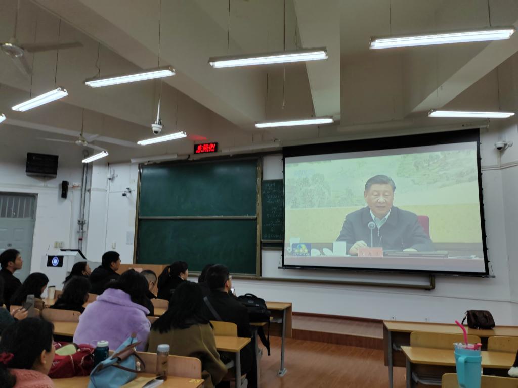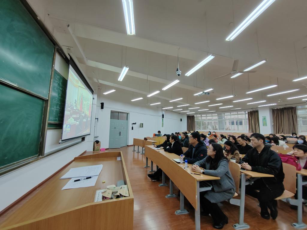 首先大家一起观看了《新闻联播》报道的《加快建设教育强国,为中华民族伟大复兴提供有力支撑》的专题片。5月29日,中共中央政治局就建设教育强国进行第五次集体学习,习近平总书记在主持学习时发表重要讲话,深刻系统阐述了中国特色社会主义教育强国的丰富内涵,科学全面回答了建设教育强国的一系列重大问题,意义重大而深远,为加快建设教育强国,指明了前进方向、提供了根本遵循。