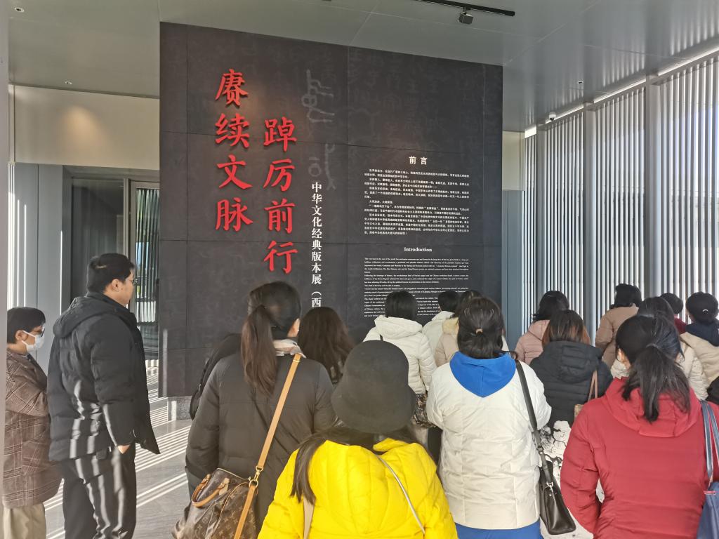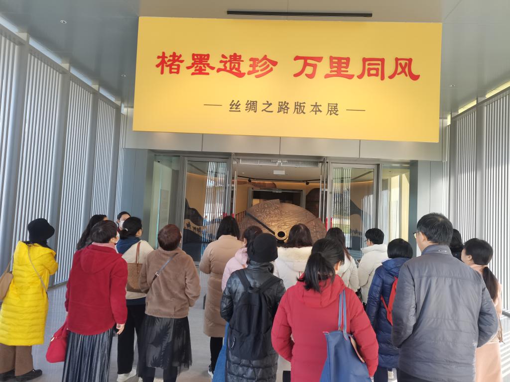 在讲解员的导引下,与会人员详细了解版本馆建设情况,依次参观学习了《赓续文脉踔厉前行——中华文化经典版本展(西部篇)》和《楮墨遗珍 万里同风——丝绸之路版本展》两个经典展览。《赓续文脉 踔厉前行——中华文化经典版本展(西部篇)》,以中华文化的经典版本为依托,立足西部,集中展出彰显民族根脉、延安精神、伟大复兴中国梦的中华文化经典版本。《楮墨遗珍万里同风——丝绸之路版本展》以丝绸之路文化为主题,以古丝绸之路文献版本为基础,以陕西典藏为依托,按照“凿空西域 丝路贯通(两汉)”“通衢延绵 殊方共享(魏晋南北朝)”“融汇通达 盛世高峰(隋唐)”“中西交汇 文脉绵长(宋元明清)”“谱写新篇 筑梦大同(新时代)”五个部分进行布展。