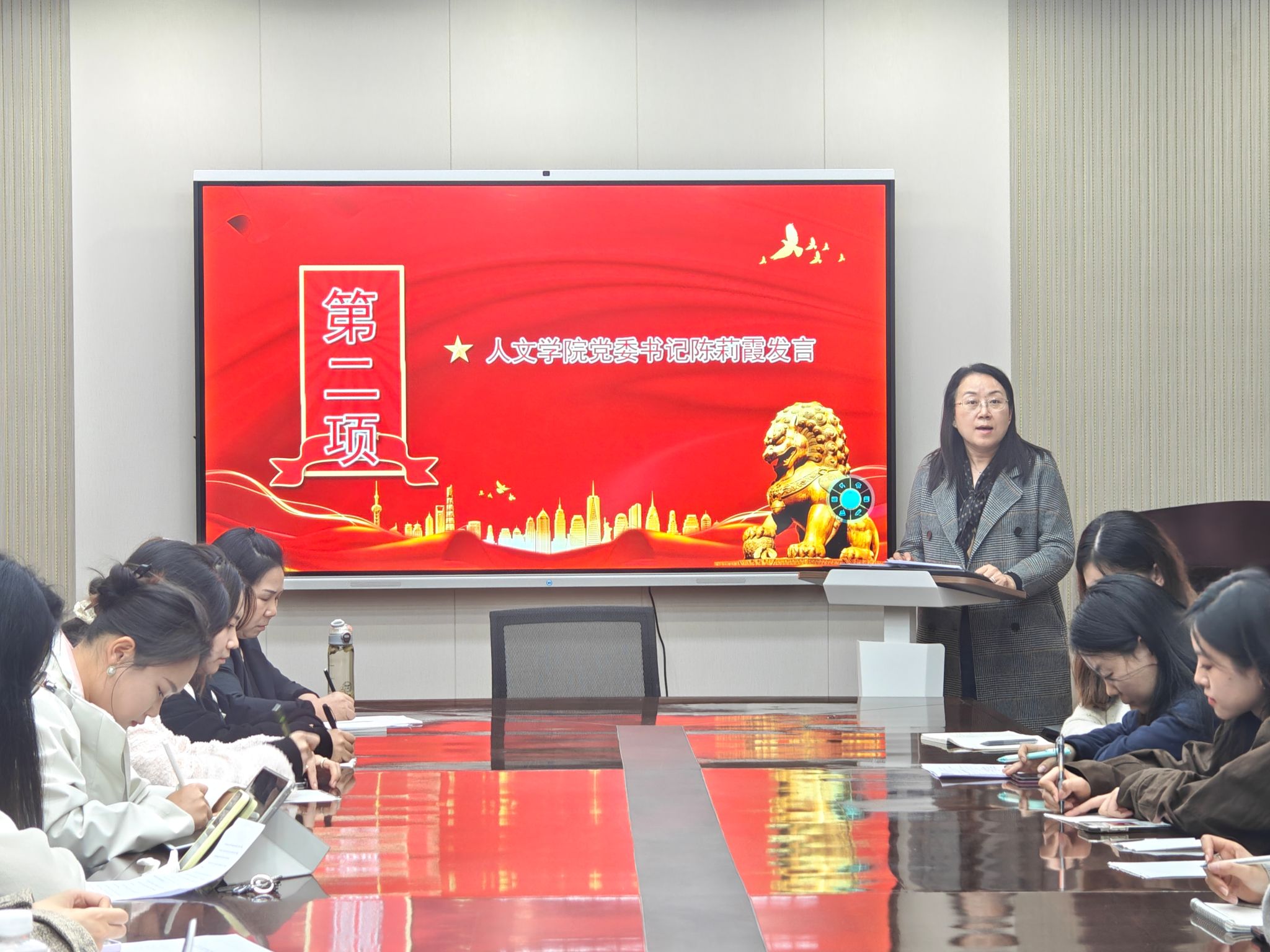 10月29日,2026世界杯官网研究生英语党支部在人文楼326会议室召开主题为“融通语言之桥,共绘时代华章”的特色主题党日活动。研究生英语支部书记张雅毅老师组织支部全体38名党员参加活动,公司党委书记陈莉霞应邀参加。