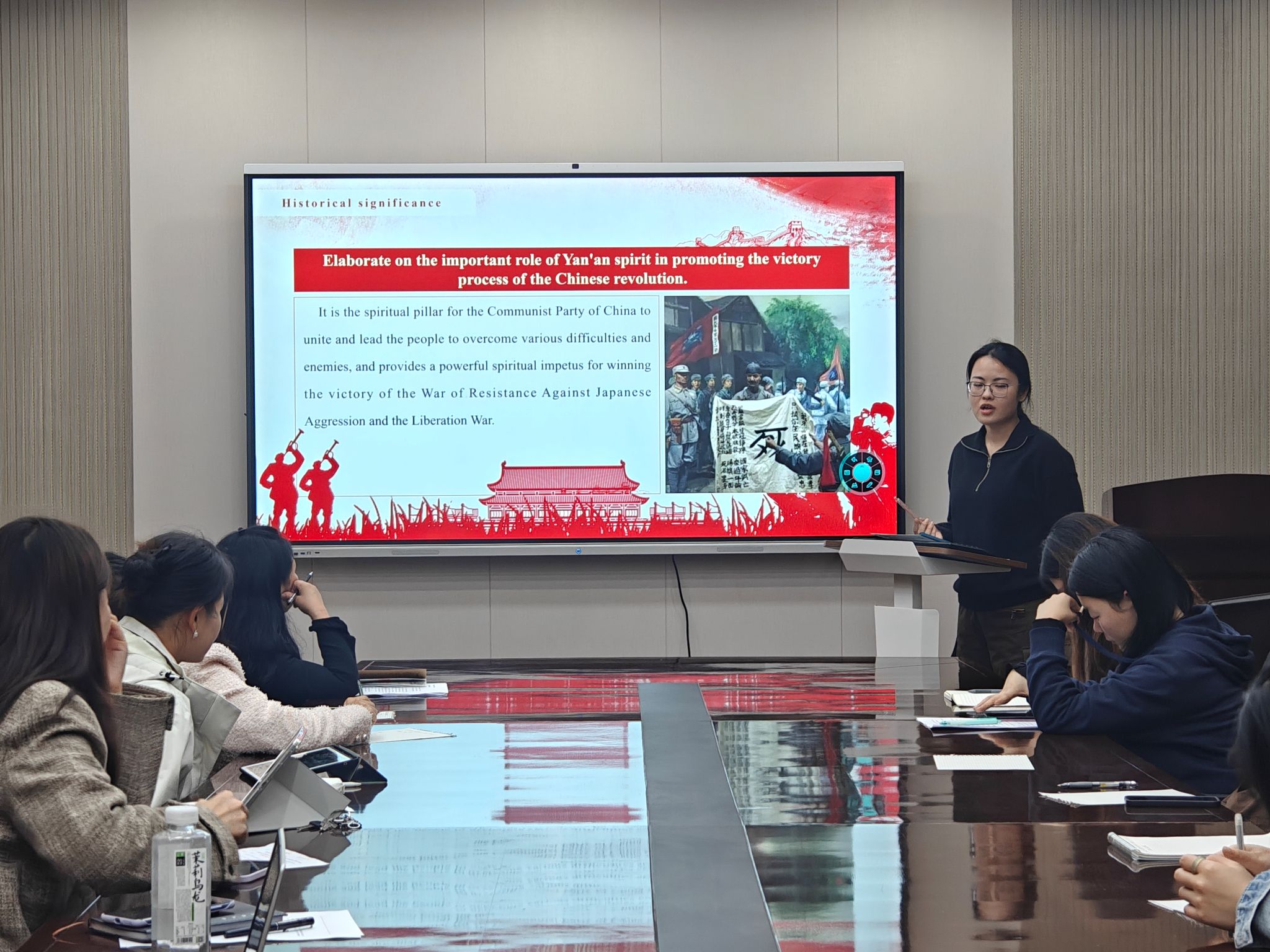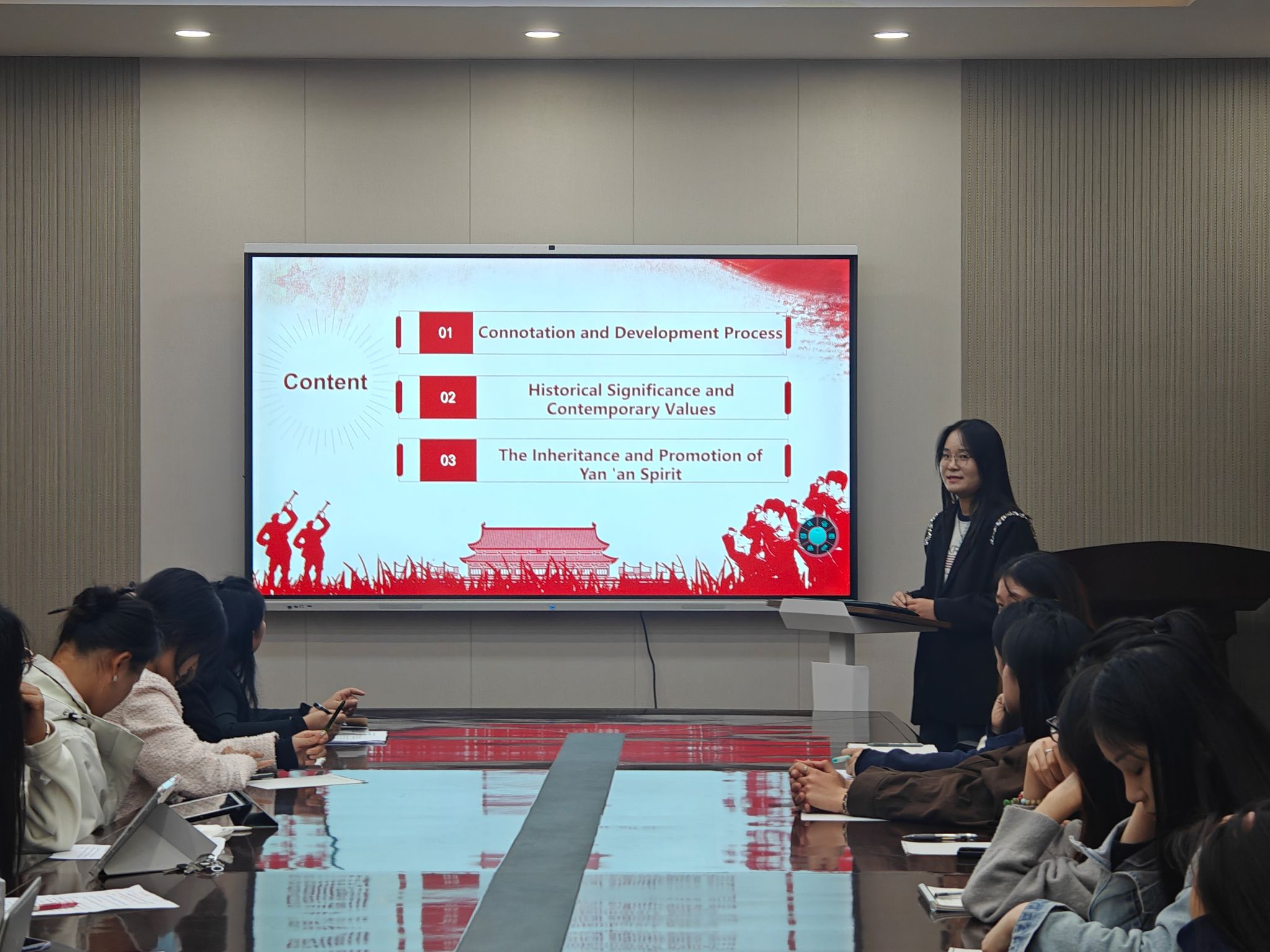 随后,支部三个党小组的成员分别从“延安精神”,“传统文化”和“时代华章”三个分主题出发,用中英双语结合做了精彩展示与分享,并围绕新时代外语人的使命与担当、如何更好地传播中华文化、向世界讲好中国故事做出了积极交流。汇报结束后,支部成员反响热烈,和老师们一起围绕“儒家文化”对当代的启迪、“一带一路”倡议的深远意义等话题展开了热烈讨论。