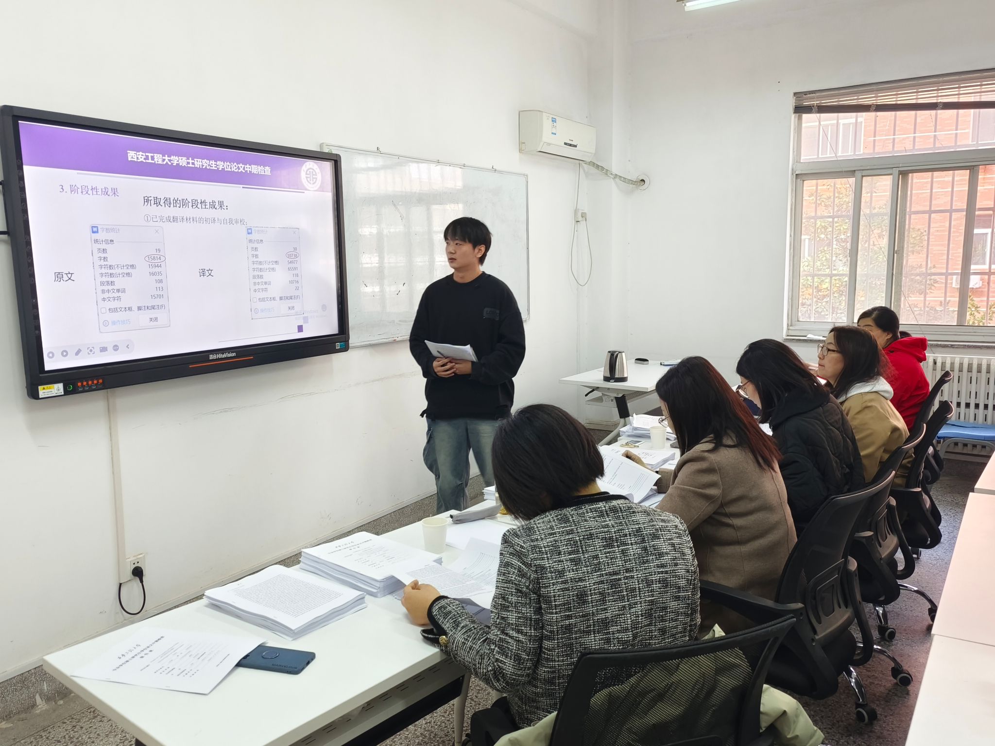 会前,答辩组长首先简要说明了中期答辩的目的、基本要求及具体流程。2022级翻译硕士生分别从学位论文及研究工作进展情况、已完成的研究内容、存在的主要问题和困难、下一阶段工作计划、学术论文发表情况以及培养计划中规定的学分完成情况等六个方面进行了个人陈述展示。随后各位导师结合答辩情况,本着对员工认真负责的态度,进行了现场提问,并针对员工此次中期检查中出现的若干问题提出修改意见和建议。
