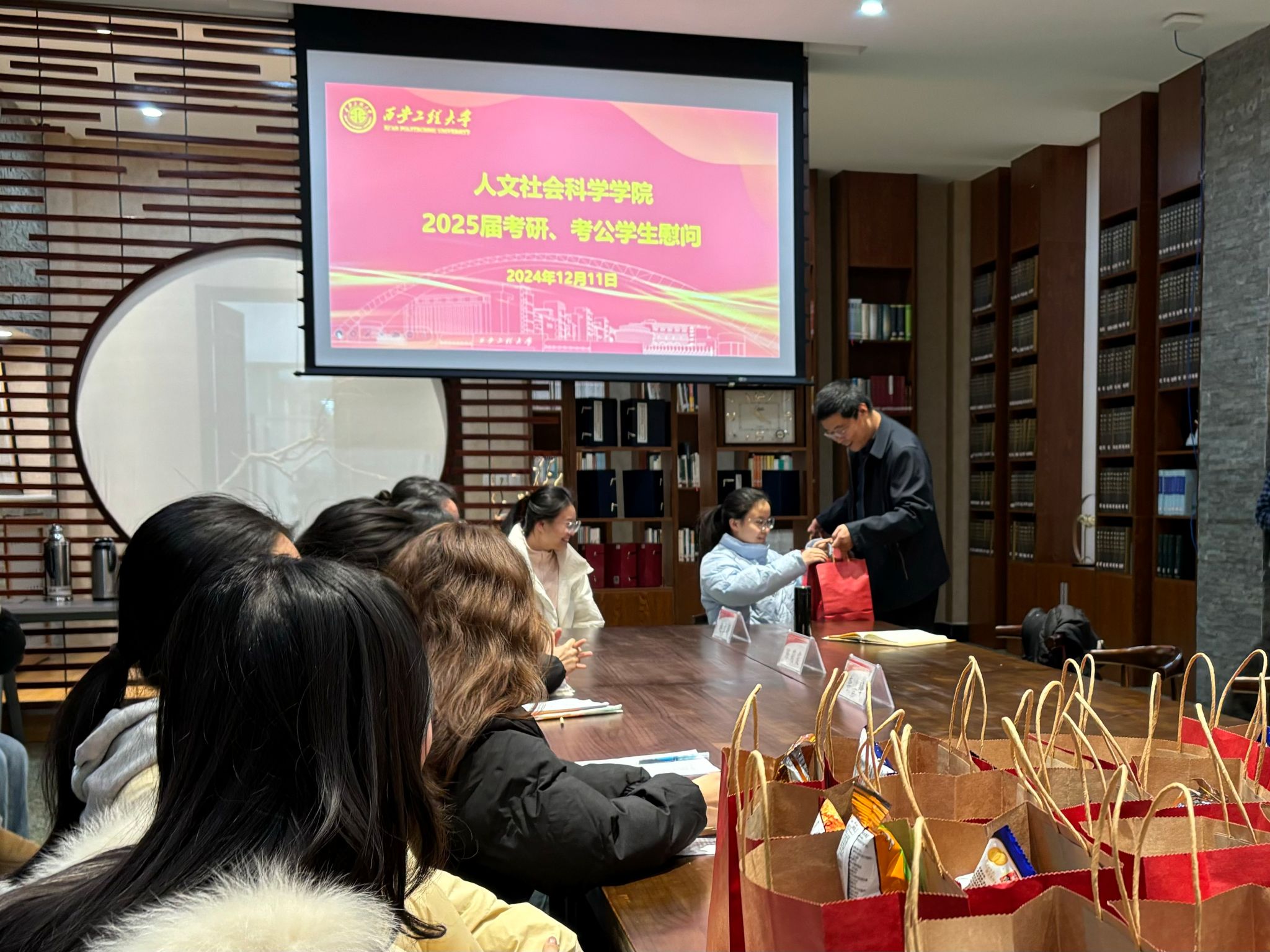 在考研、考公的冲刺阶段,为鼓舞员工士气,缓解备考压力,12月11日下午,公司党委副书记赵立涛及全体辅导员在临潼校区骊山书院慰问了2025届全体考研、考公员工,为同学们送去温暖与关怀。