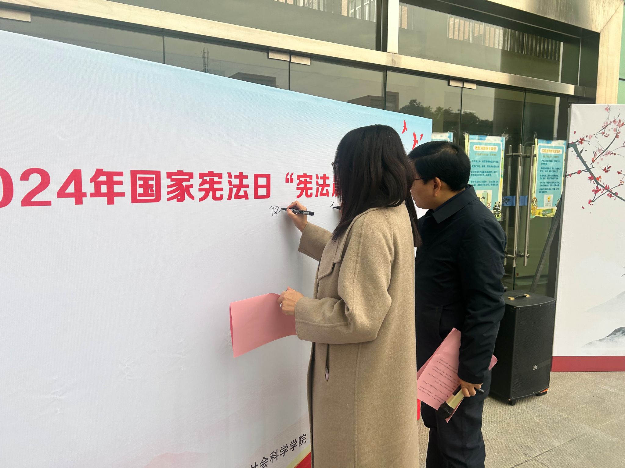 活动现场,全体师生庄严肃立,在陈莉霞和李喜峰的依次带领下,齐声诵读宪法条文。洪亮而坚定的声音回荡在校园中,彰显了大家对宪法权威的尊重与维护。通过逐字逐句的朗读,宪法精神更加深入人心,让师生们深刻认识到宪法作为国家根本大法的重要地位和作用。诵读结束后,师生代表积极在“弘扬宪法精神”宣传板上签名留念。