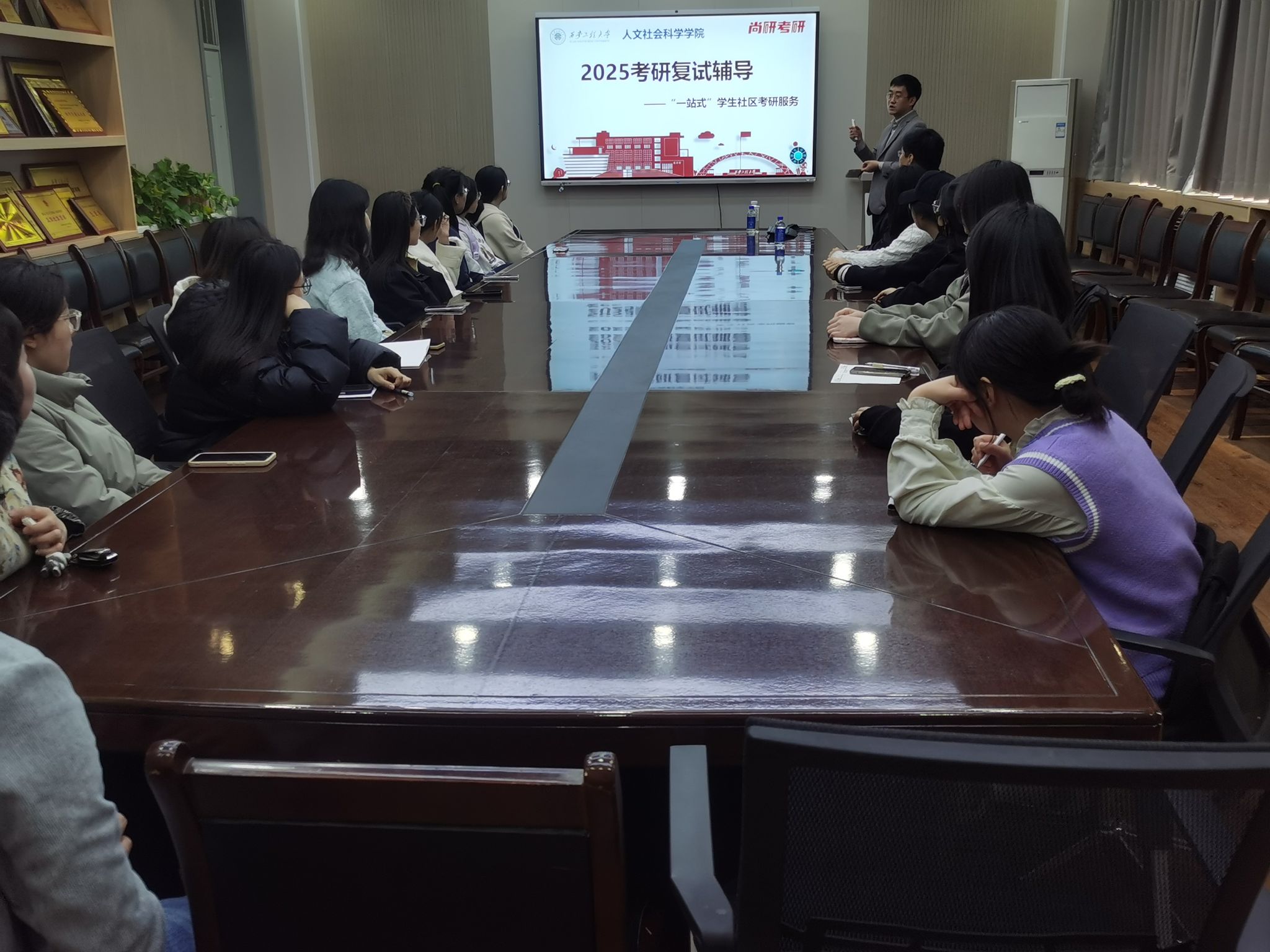 贺波老师以“复试制胜:多维能力构建与实战策略”为题展开深度辅导。针对人文社科类专业复试特点,他系统解析了“专业素养考察”“综合能力评估”“个性化展示”三大核心模块,重点讲解了文献综述撰写技巧、面试应答逻辑框架以及科研潜力挖掘方法。通过典型案例剖析与情景模拟,指导员工掌握“STAR法则”在问题应答中的应用,并现场示范如何通过非语言沟通增强个人表现力。互动环节中,同学们围绕“复试如何凸显优势”“面试突发情况应对”等热点问题踊跃提问,贺波老师结合多年辅导经验逐一给予专业解答。