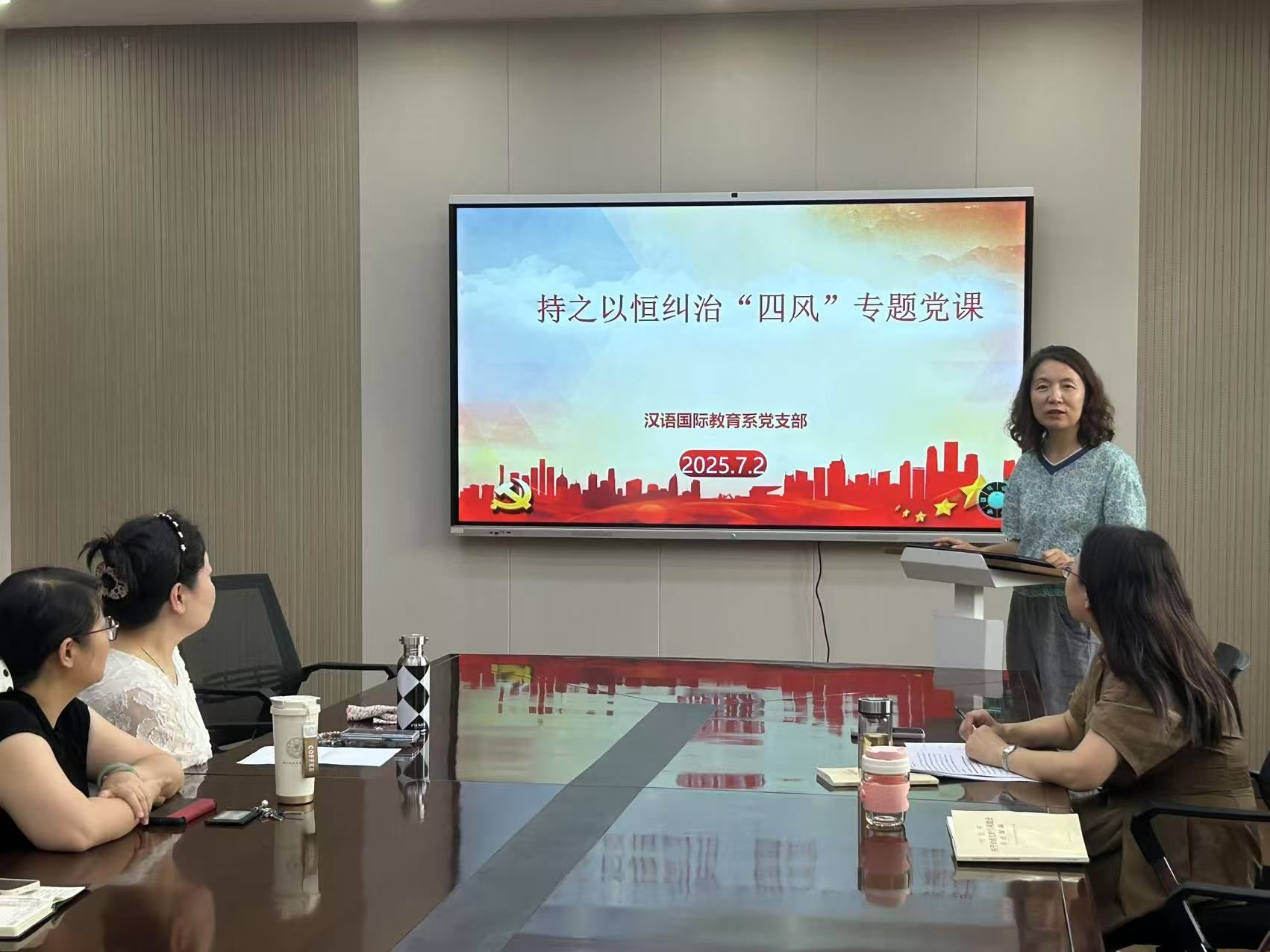 党课现场,支部成员结合课程思政建设、员工管理等工作展开热烈讨论。青年教师党员刘婧表示,“将把纠治‘四风’与提升汉语国际教育质量相结合,在跨文化教学中杜绝‘走过场’,以扎实作风讲好中国故事。”