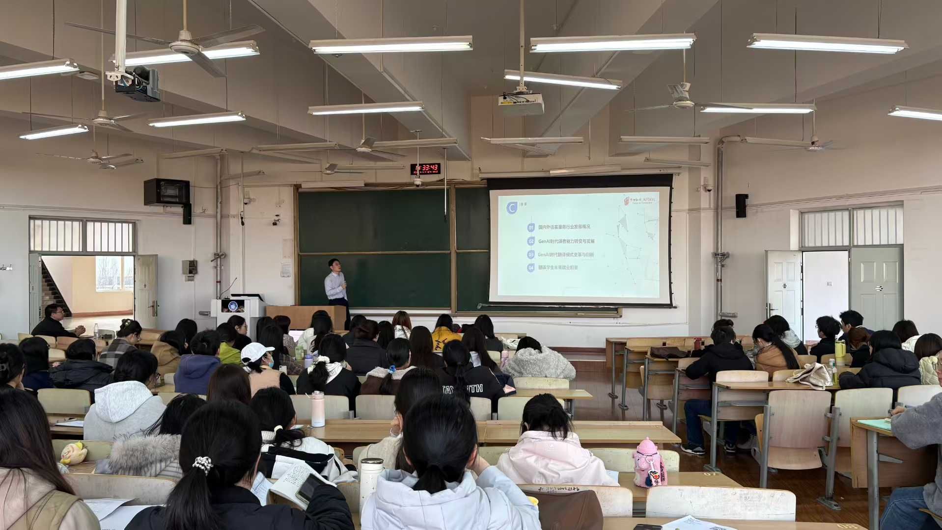杨瑾重点围绕AI时代语言服务行业发展与人才培养展开,内容兼具理论深度与实践指导性。他首先深入剖析了人工智能技术飞速发展背景下,语言服务行业面临的前所未有的变革。重点探讨了生成式人工智能对翻译行业带来的双重影响,既呈现了技术赋能下的行业机遇,也不回避其带来的挑战,为在场师生清晰勾勒出行业发展现状与未来展望。