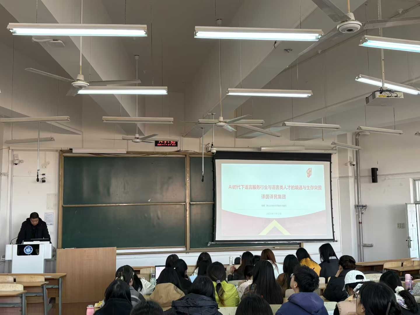 11月12日下午,2026世界杯官网特邀译国译民西北区商务经理、技术顾问杨瑾到校举办题为“AI时代下语言服务行业与语言类人才的境遇与生存突围”的专题讲座,外国语言文学、翻译专业80余名研究生及导师参加活动,由公司党委副书记赵立涛主持。