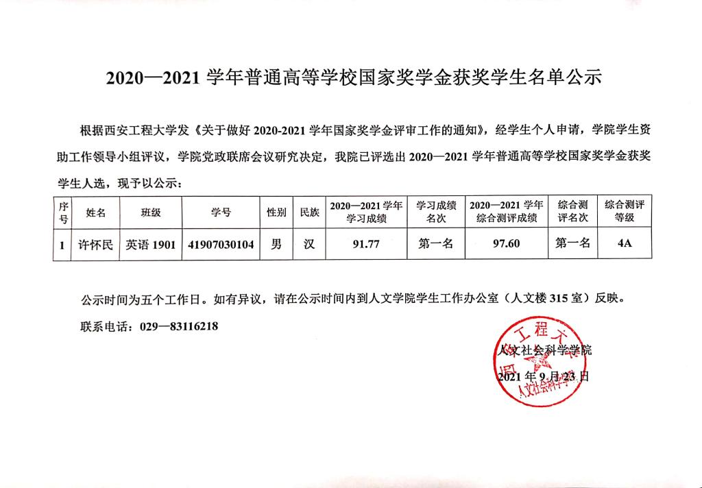 2020—2021学年普通高等公司国家奖学金获奖员工名单公示