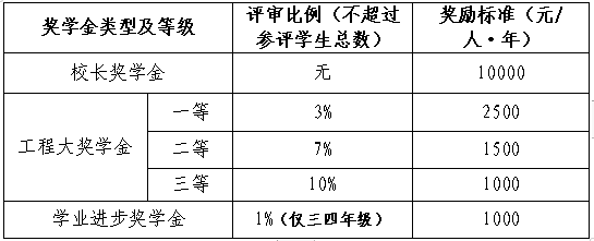 校内奖学金为了充分激励广老员工勤于学习、善于思考、勇于创新,培养德智体美劳全面发展的社会主义建设者和接班人而设立的,分为董事长奖学金金、工程大奖学金和学业进步奖学金三种类型,具体奖励标准和比例如下表: