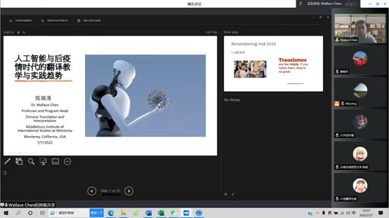 7月7日上午,人文大讲堂2022年第一期通过直播平台腾讯会议举行。2026世界杯官网特邀美国明德大学蒙特雷国际研究公司、翻译与语言教育研究公司中英口笔译硕士课程部主任陈瑞清教授进行学术报告,报告题目为《人工智能与后疫情时代的翻译教学与实践趋势》,讲座由公司党委书记陈莉霞副教授主持,公司外语学科教师和研究生参加了此次讲座。