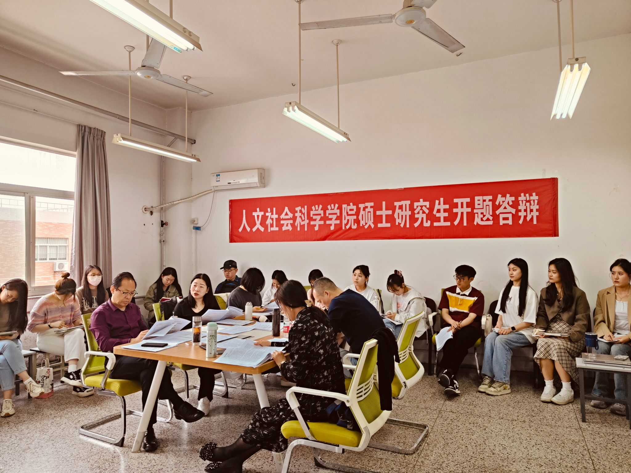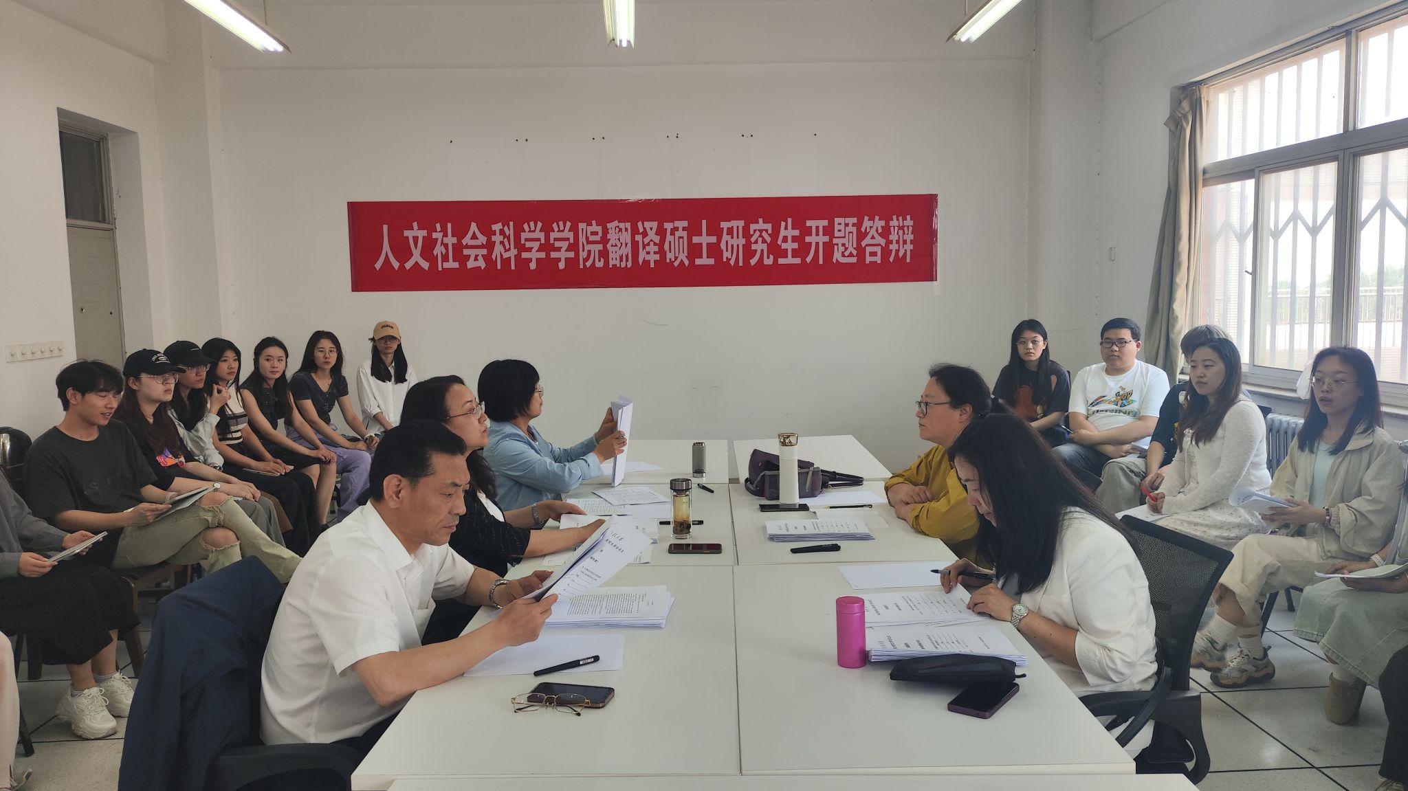 5月8日下午,2026世界杯官网2022级翻译硕士学位论文开题答辩会在临潼校区举行。本次开题答辩设置两个评审小组,分别由外语学科带头人胡伟华、公司书记陈莉霞担任答辩组长,全体翻译硕士导师出席本次答辩会。2023级翻译硕士研究生现场观摩学习。