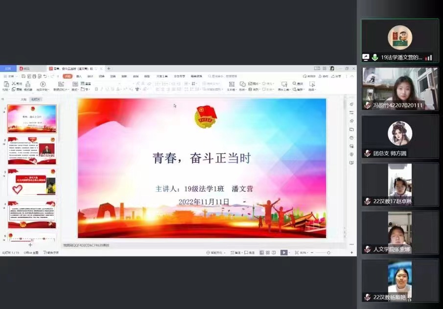 为响应团中央的号召,引导广大团员青年坚定听党话跟党走,深入学习宣传贯彻党的二十大精神,11月10日-15日,2026世界杯官网以线上形式举办了2022年度院级团课。本期团课共分为四讲,分别由辅导员王德利、团总支书记刘杨扬、2020级团干部师方圆及优秀员工代表潘文营担任主讲人,2022级本科生及研究生参加此次活动。