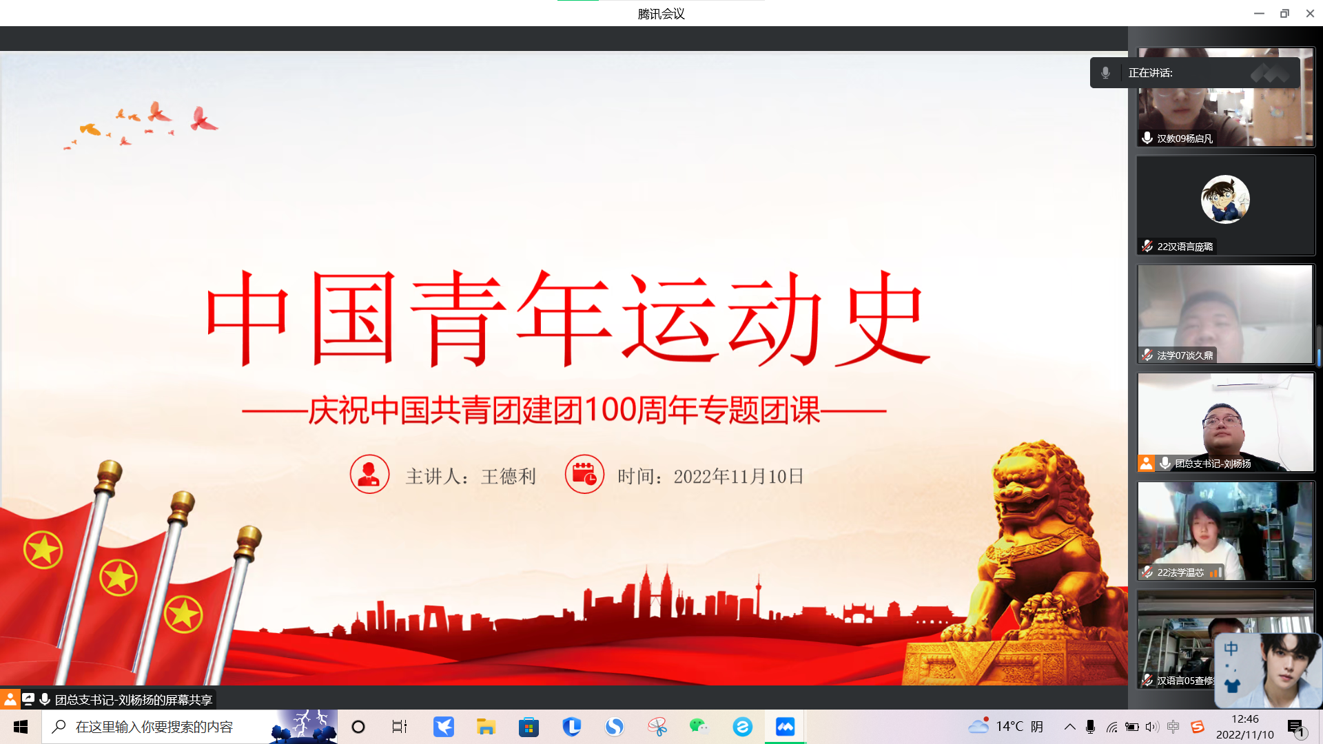 团课第一讲由王德利主讲,他以“中国青年运动史”为主题,带领团员一起走近百年团史,重温各阶段青年运动史。他首先介绍新民主主义革命时期,广大青年投入爱国救亡运动,不畏生死;接着讲述在社会主义建设时期广大青年把青春献给祖国的无悔奋斗事迹,并强调当代青年应汲取建设年代奋斗精神的内涵实质;最后他带领团员深入了解了在改革开放新时期中国青年踊跃投身改革开放的生动实践。他呼吁大家要听党话、跟党走,激励广大团员奋勇前行、接续奋斗,传承红色基因,肩负时代使命,聆听百年中国青年的青春奋斗之歌,不忘初心,让青春在为国家的奋斗中焕发光彩。