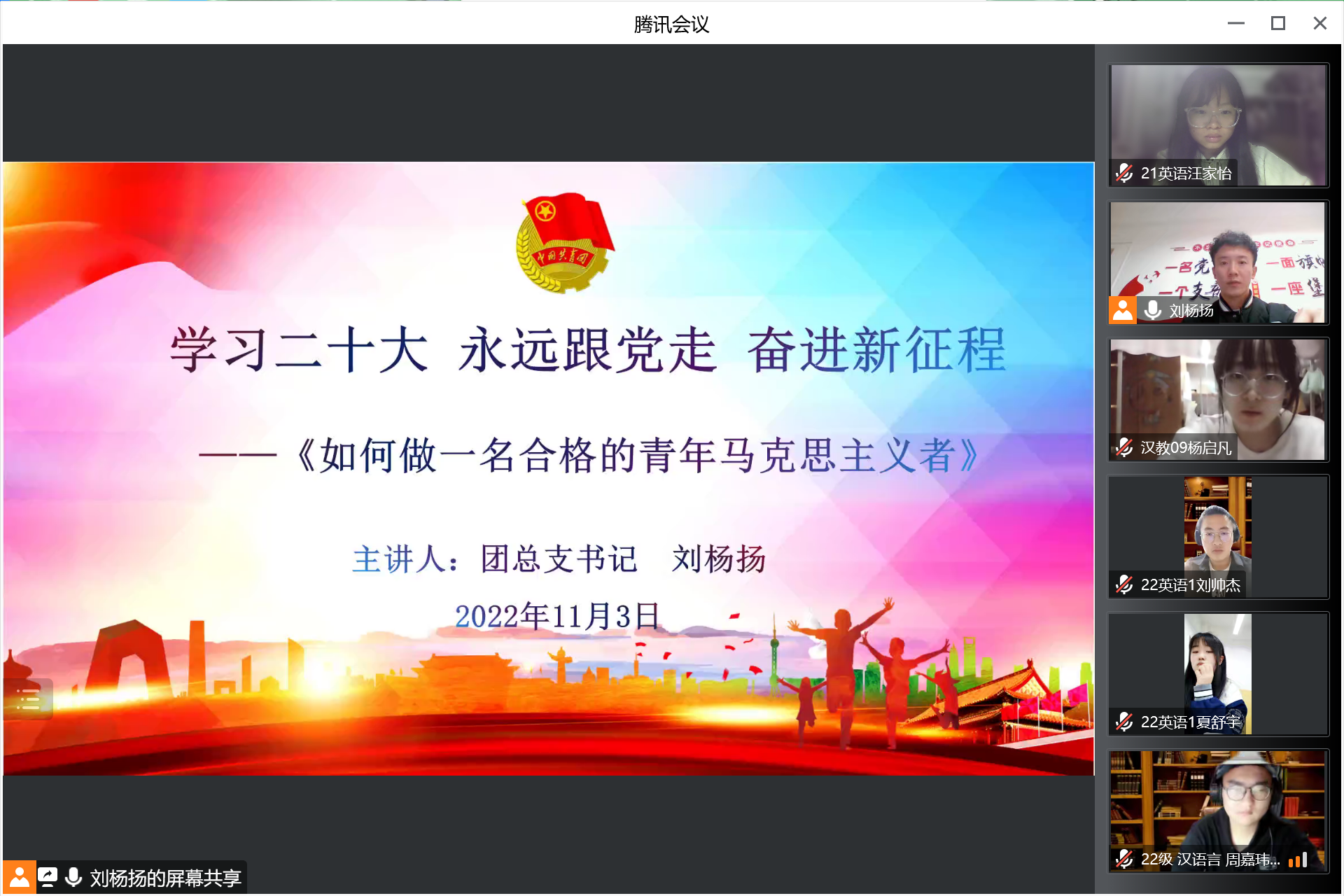 团课伊始,团总支书记刘杨扬带领大家学习了方璇、付凡平以及奋战在疫情防控第一线的“最美逆行者们”的先进事迹,通过习近平总书记在纪念马克思诞辰200周年大会上重要讲话,引导大家共同思考“作为新时代青年,为什么要成为合格的马克思主义者”。随后,通过关于合格的青年马克思主义者“要有坚定的马克思主义信仰、要练就过硬本领、要坚定人民立场、要锤炼高尚品格”四个方面的讲解,学习了如何做一名合格的青年马克思主义者。最后,刘杨扬勉励全体团员青年“要接过历史的接力棒,面向实际、深入实践;严谨务实、苦干实干;坚持学以致用、以用促学。