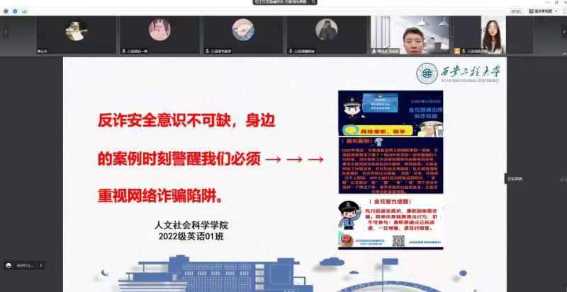 此次安全教育主题班会活动主要围绕疫情防控、电信诈骗、金融安全、网络安全、消防安全、实习安全等多个主题开展。各班级通过结合PPT进行案例剖析、视频观看、创作海报、制作推文等多种形式开展安全教育活动。