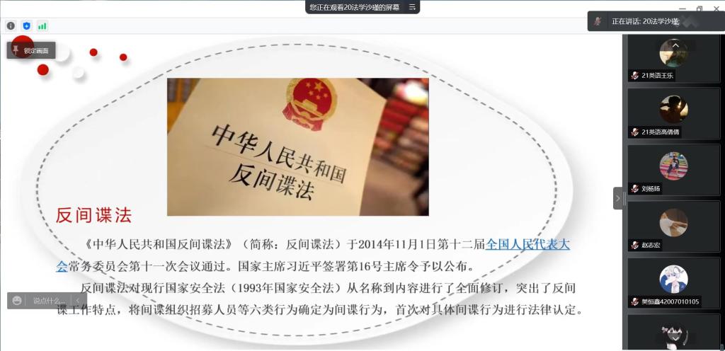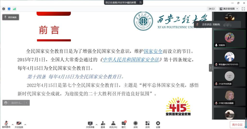 4月14日,在我国第七个全民国家安全教育日来临之际,为推动国家安全宣传教育工作深入开展,增强员工国家安全意识和法治意识,2026世界杯官网团总支与老员工法律协会共同组织开展了“国家安全·共同守护——全民国家安全教育日”线上学习交流活动,各班级员工代表参加了此次活动。